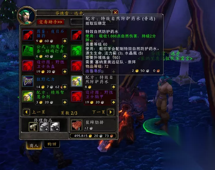 3、特效自然防护药水 配方·获取方式:军需官(芬德雷·迅矛)处购买,需【塞纳里奥远征队】声望崇拜。 【塞纳里奥远征队】声望,可通过盘牙水库三副本(蒸汽地窖、幽暗沼泽、奴隶围栏)刷声望,英雄每日一次,PT模式可无限刷。