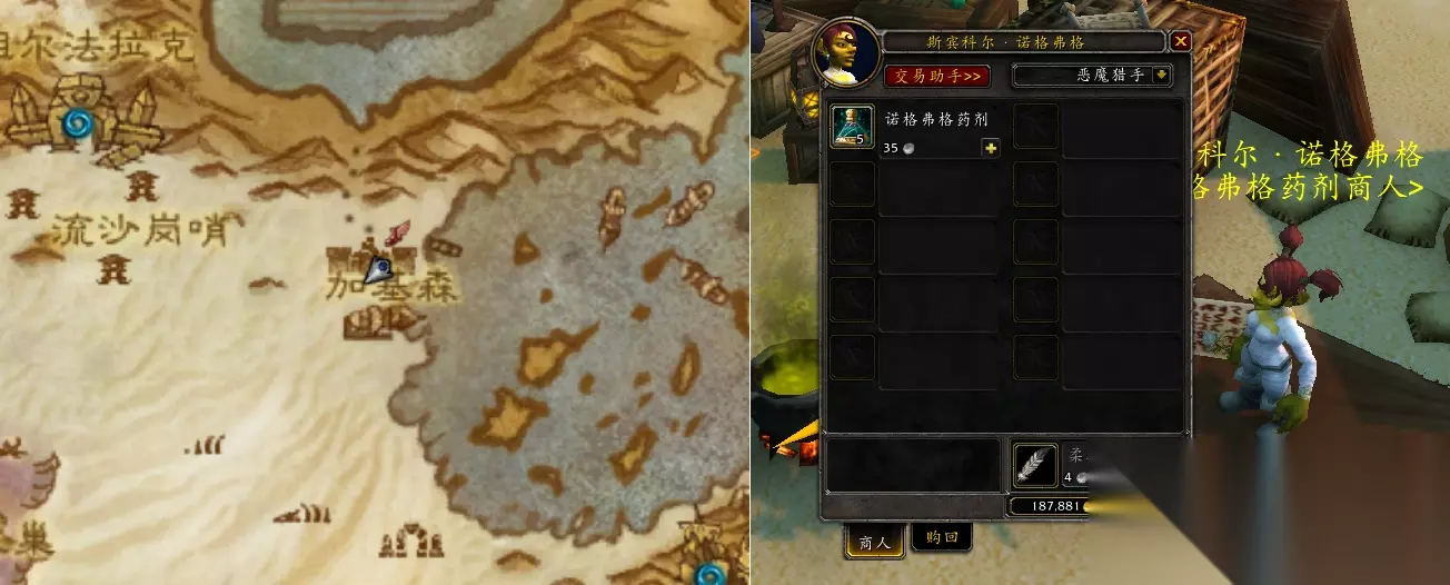 以上配方中的材料,如果有刷副本和小怪的玩家,基本会获得,不够的可以AH购买,不贵! 7、[诺格弗格药剂]购买点:位于卡利姆多大陆-塔纳利斯-加基森(坐标:51 29)处购买。 使用此药剂:随机获得-漂浮、变身骷髅、变小三种效果,至少买个20个备着。