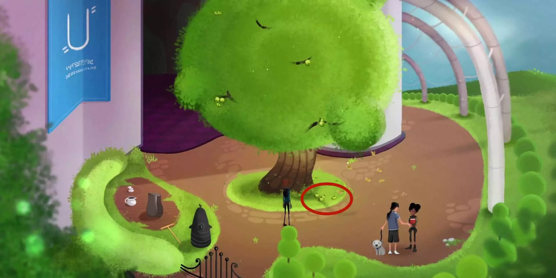 52.前往户外的庭院,使用【弗丽达的指纹】通过石碑的指纹识别,选择【夏季】,拾取大树下的【苹果】。52.1
