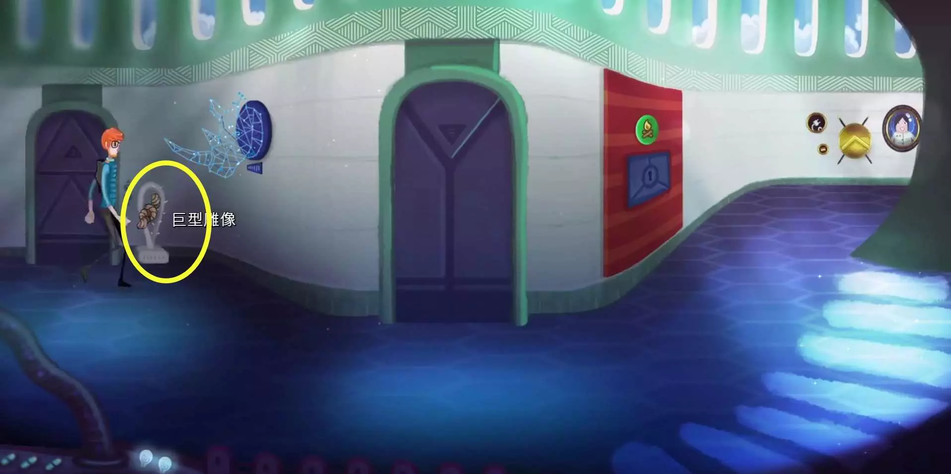 47.乘坐电梯上2楼,对走廊的巨型雕像使用【绳子】,获得【细线】。47.1