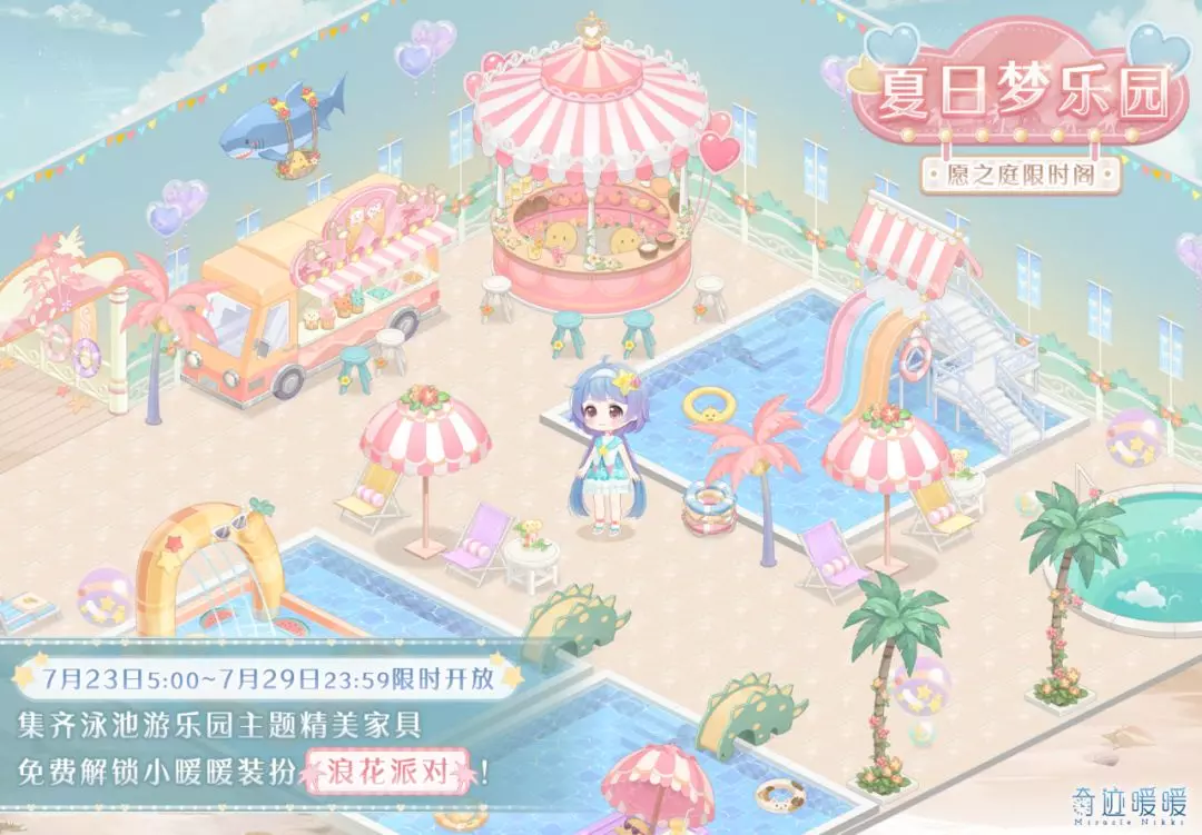 7月23日5:00—7月29日23:59,在小屋愿之庭的限时抽奖阁“夏日梦乐园”许愿,可获得泳池游乐园主题家具!集齐所有限定家具还可领取全新小暖暖装扮“浪花派对”!