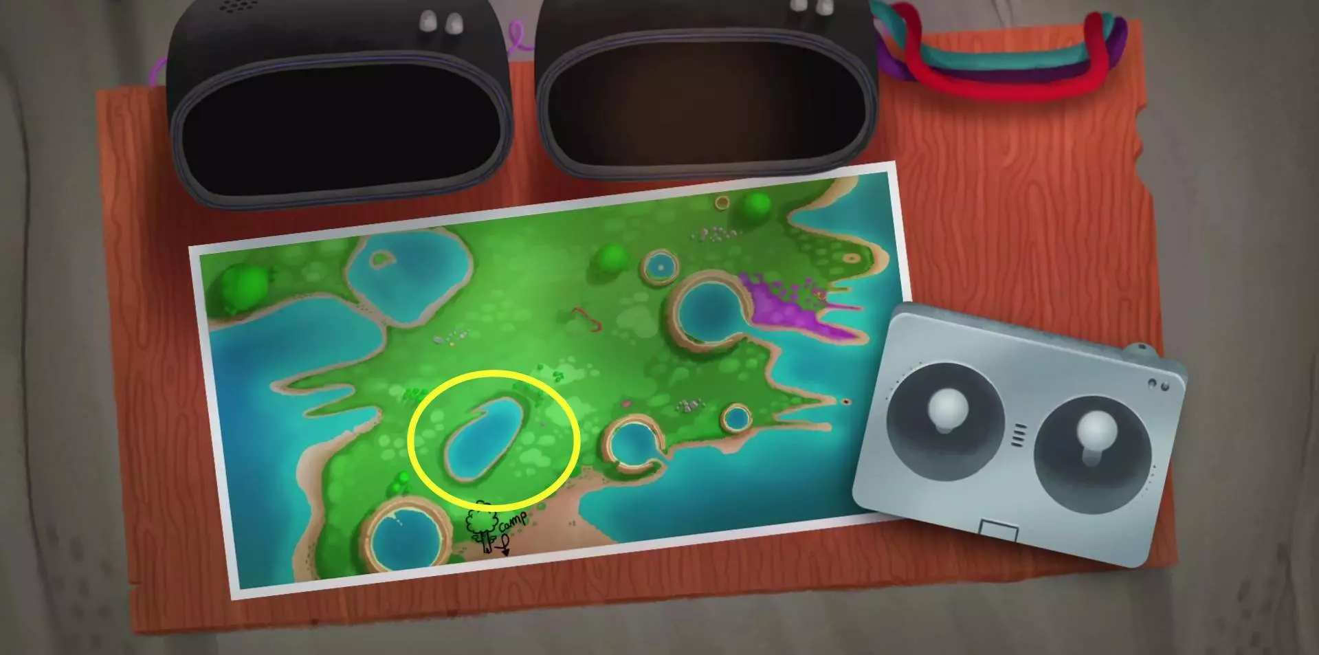 112.拾取桌子上的【双筒望远镜】,点击湖泊与山丘之间的位置,找到赛特。(之后在地图上指出对应位置,触发剧情。)112.1