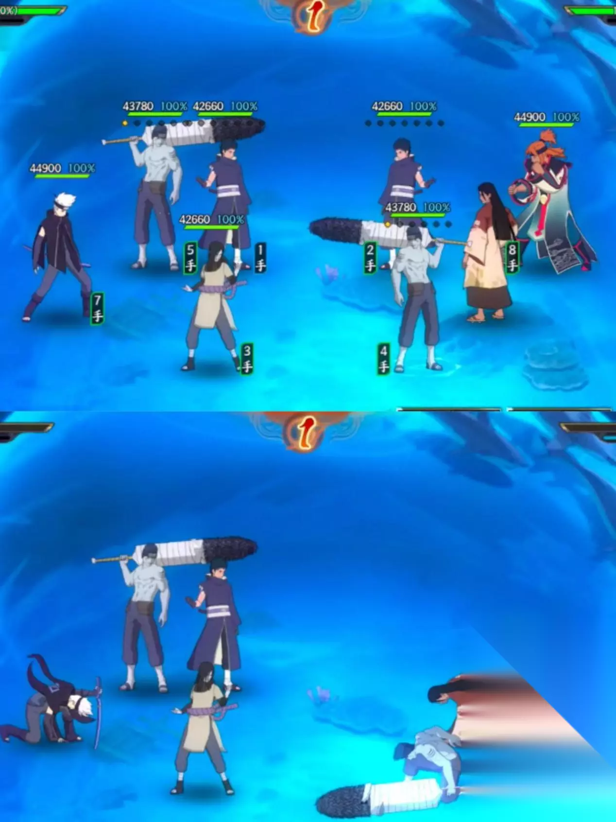 敌方阵容: 干柿鬼鲛[狂野鲛鲨]+宇智波带土[忍界大战]+千手柱间[和服]+土主 实战解析: 第一回合: 1、我方普攻及追打,对方带土下个行动将失效; 2、我方大蛇丸使用奥义,对方小队受到蛇之眼,普攻将受到伤害; 3、对方柱间使用奥义,我方大蛇丸抢先使用奥义,对方柱间战败,对方带土下个行动将失效; 4、对方获得火之意志,普攻次数及属性攻增加; 5、我方鬼鲛奥义,被对方鬼鲛打断; 6、对方土主奥义,我方带土奥义打断,并累积能量点; 7、我方雷主奥义,将多次普攻回复查克拉; 8、对方带土使用奥义,累积能量点; 9、我方鬼鲛被动伤害以及带土奥义伤害击败对方两位忍者,并将剩余的带土移出战斗,我方获胜。