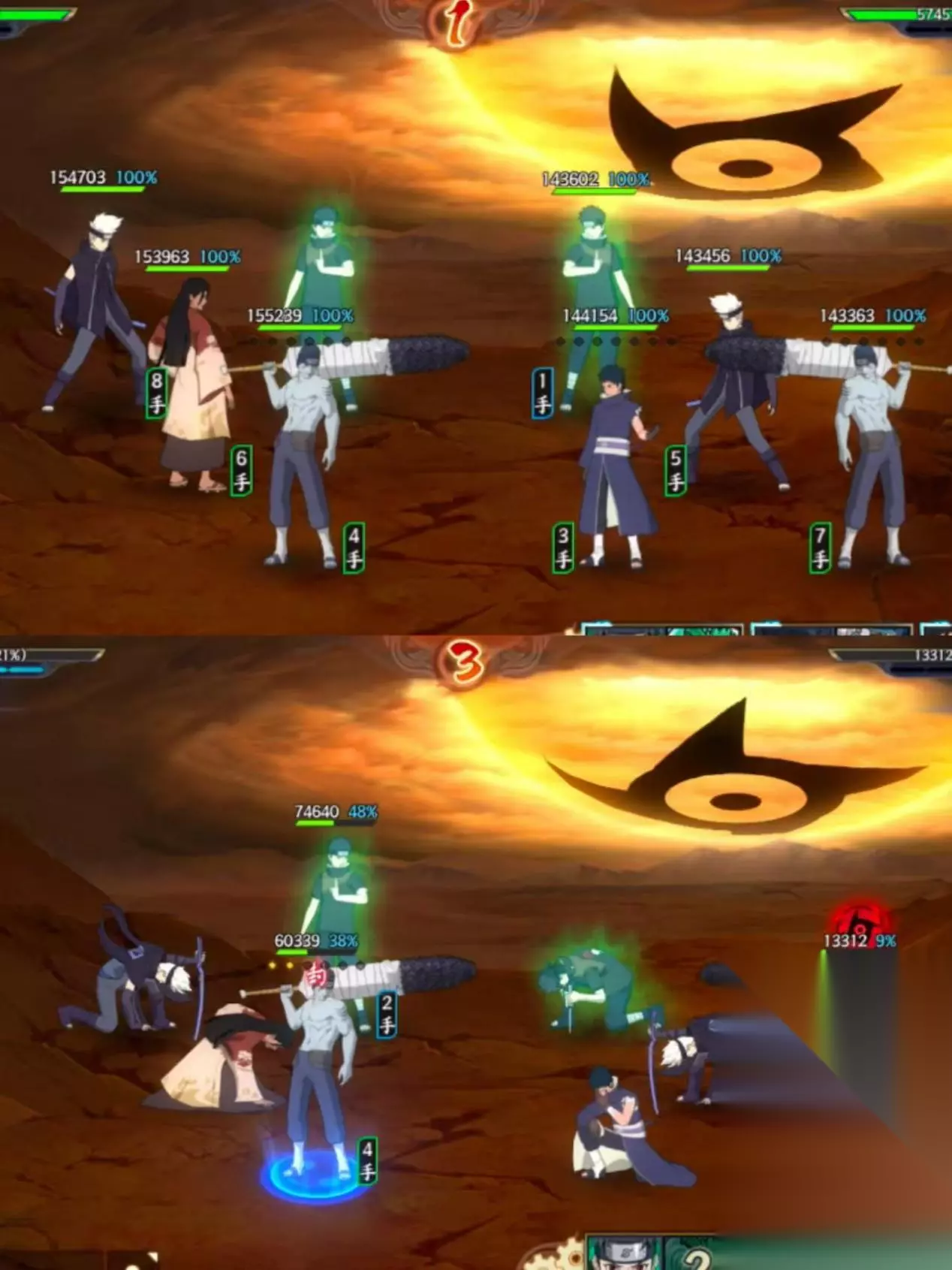 阵容优点: 1、查克拉充足; 2、拥有多次结界与免伤效果; 3、可将对方忍者移出战斗; 4、能多次治疗我方单位; 5、可策略性让对方忍者下个行动失效; 6、小队忍者成长较好; 7、比较克制对方普攻较多的阵容; 8、开局可破除对方闪避,普攻后有机会追打使对方忍者下个行动失效。 Tip:站位可自行调整。 阵容缺点: 1、需要普攻或受击后才有充足查克拉,可能影响奥义顺序策略; 2、对先攻较高,才能实现奥义策略; 3、结界会相互覆盖,可能会把更有战略作用的结界顶掉; 4、没有解控能力,惧怕被控制。 (三)实战分析3(斗祭)