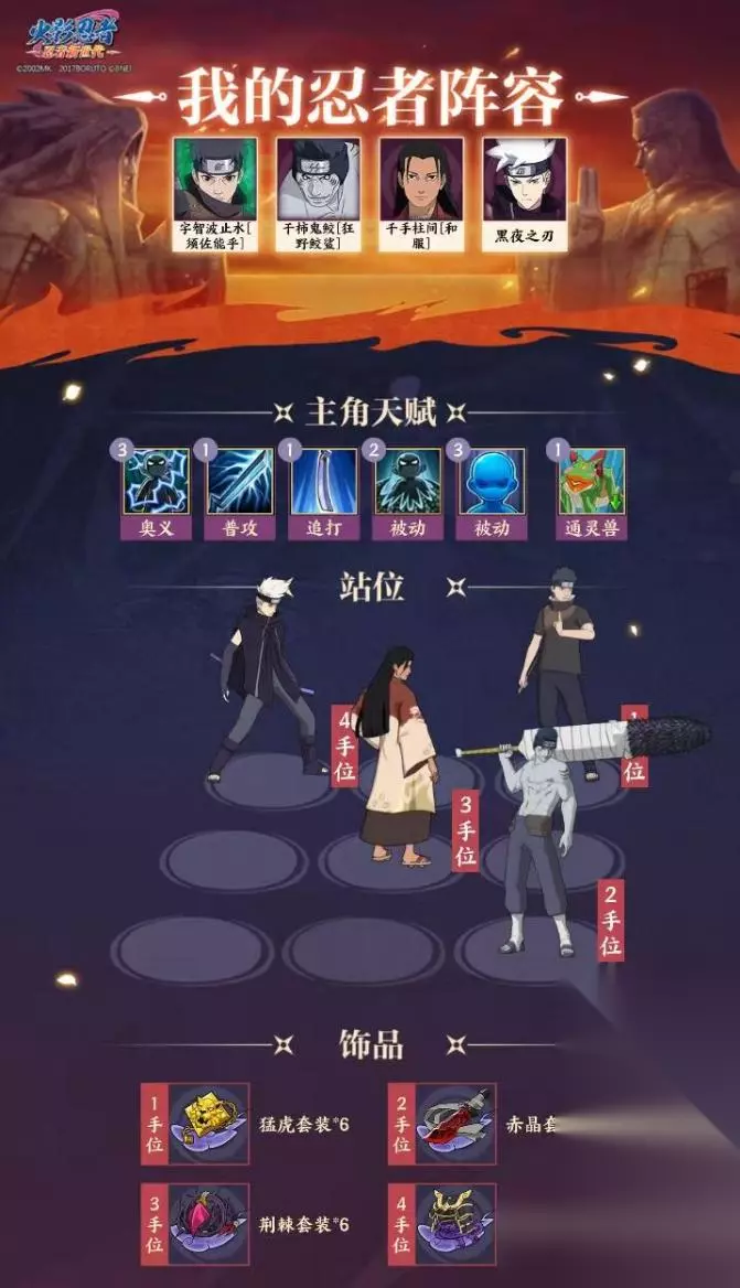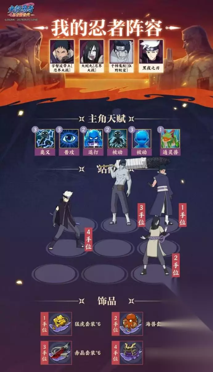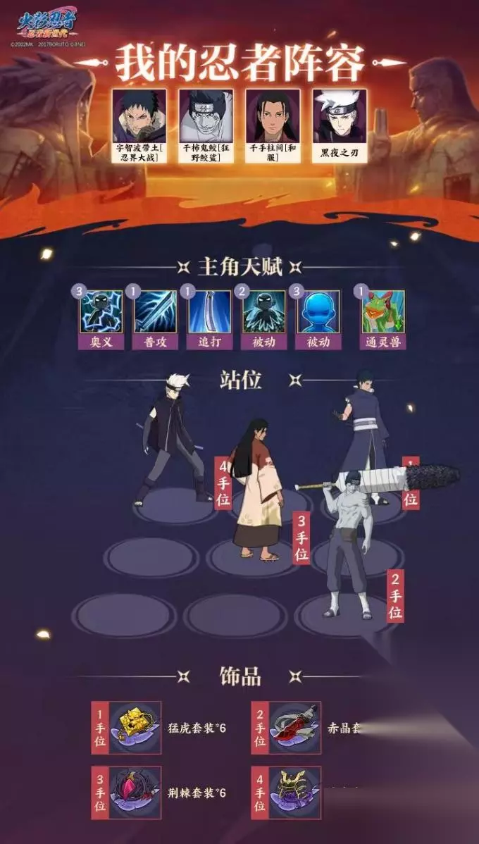 特殊词条: 查克拉吞噬伤害:攻击时将对敌人造成额外伤害,当目标查克拉数量越高时,额外伤害越高,最高49999。查克拉吞噬伤害=(敌方最大生命值*敌方拥有的查克拉%) 水牢之术:对正面敌小队生命值最高的单位造成水牢,必中。 水牢:封印术,无法行动,持续1回合。不可被免疫,可以被驱散。 水波秘境:结界首次开启时回复20点查克拉,后续每次开启结界为己方小队回复10%最大生命值并成长20%体忍。结界存在时,正面敌方小队每次普攻都将受到当前查克拉%*10%*最大生命值的伤害,最高49999。 水遁·五食鲛:对正面敌方小队造成30%伤害,并且额外附带20%查克拉吞噬伤害。之后重启结界。 鲛肌吞噬:双方小队每获得或消耗20点查克拉,鬼鲛增加1点刀技,满6点后释放水遁·五食鲛。 忍者定位:攻守兼备、辅助小队 推荐饰品:赤晶、玄龟、战鬼、荆棘、翠玉 二、搭配思路: 1、结合干柿鬼鲛[狂野鲛鲨]的技能特点,一图流搭配推荐: