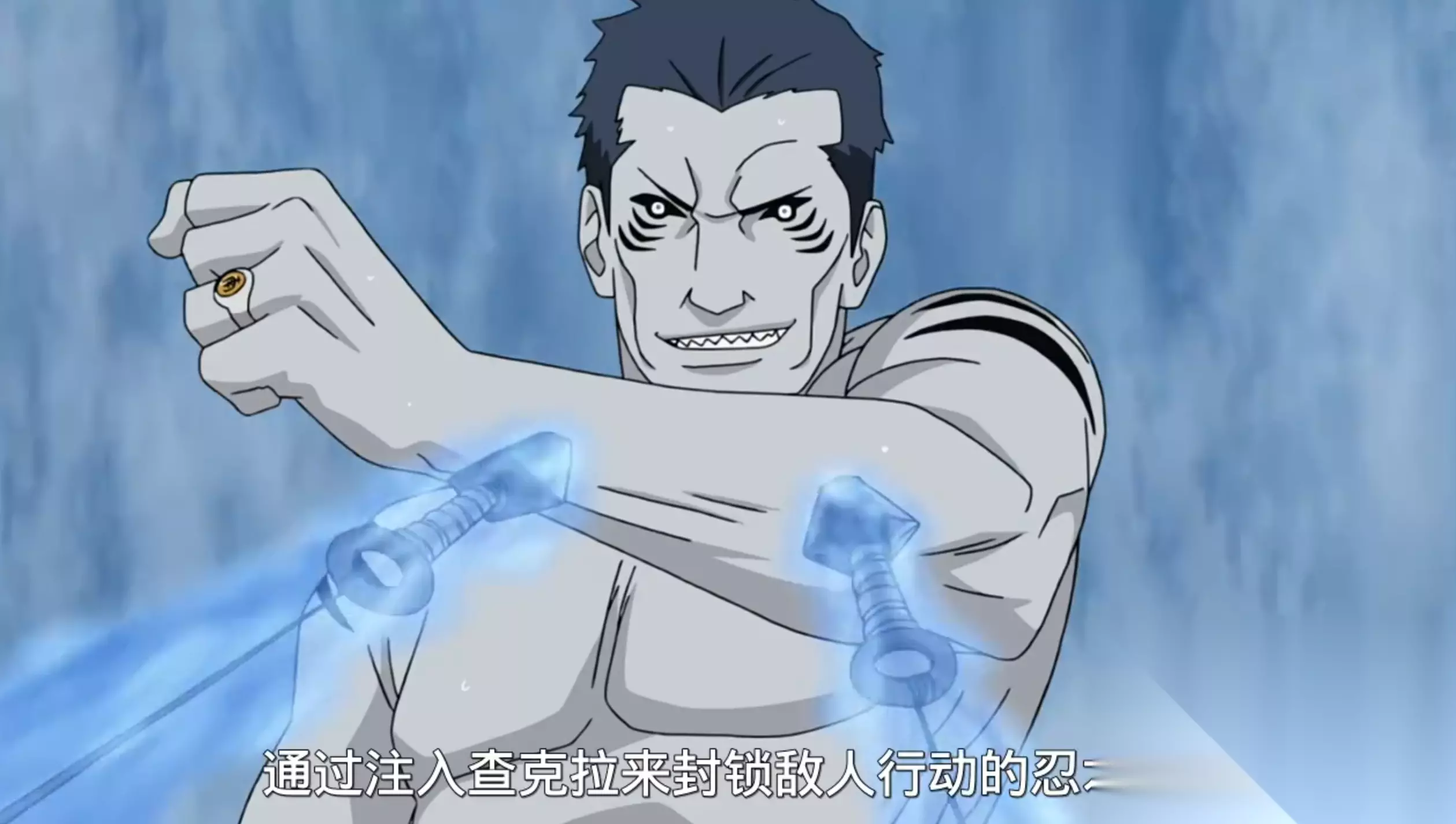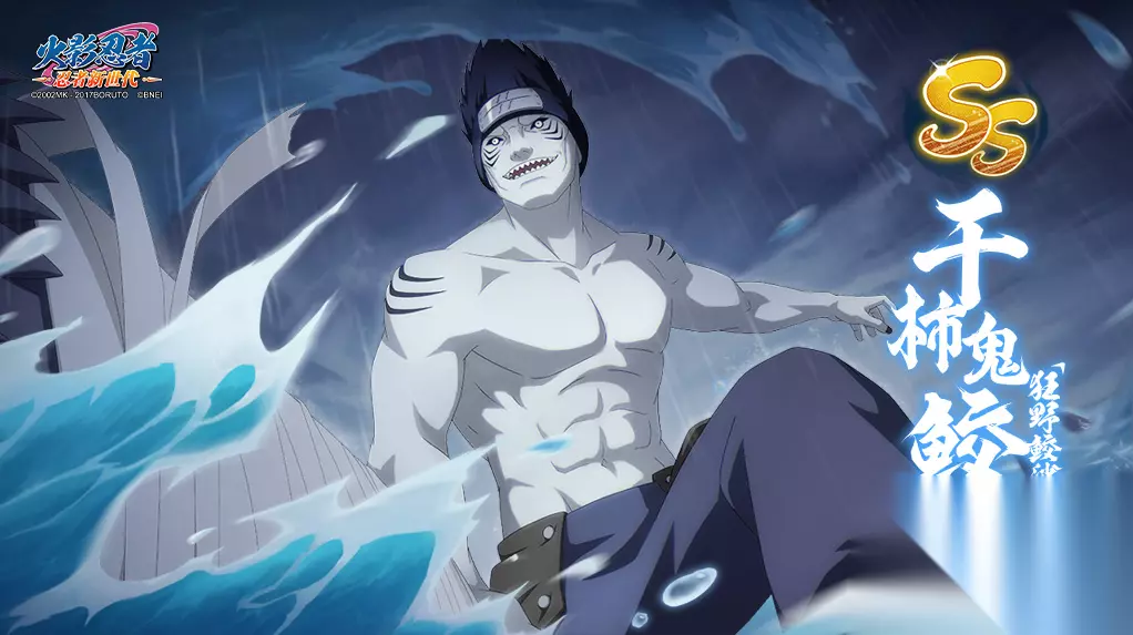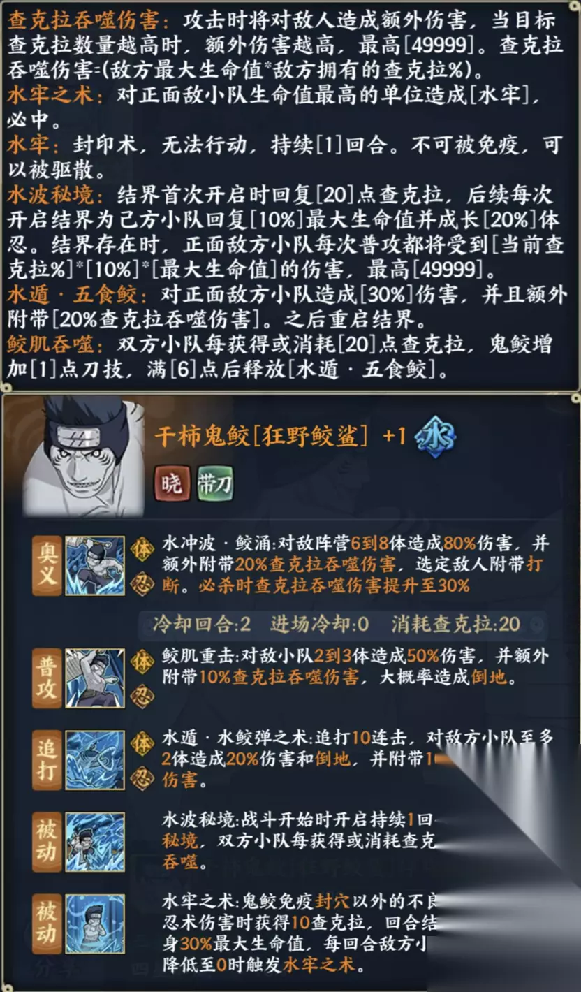 奥义:水冲波·鲛涌:对敌阵营6到8体造成80%伤害,并额外附带20%查克拉吞噬伤害,选定敌人附带打断。必杀时查克拉吞噬伤害提升至30%。 Tip:阵营伤害,会根据敌人的查克拉浮动,附带打断能力。 普攻:鲛肌重击:对敌小队2到3体造成50%伤害,并额外附带10%查克拉吞噬伤害,大概率造成倒地。 Tip:普攻多体伤害,虽然伤害系数低,但会根据敌人查克拉浮动,同时配合自身养成,伤害可观。 追打:水遁·水鲛弹之术:追打10连击,对敌方小队至多2体造成20%伤害和倒地,并附带10%查克拉吞噬伤害。 Tip:追打的触发条件较为简单,伤害会根据敌人的查克拉浮动。 被动Ⅰ:水波秘境:战斗开始时开启持续1回合的结界水波秘境,双方小队每获得或消耗查克拉时触发鲛肌吞噬。 Tip:鬼鲛的核心被动,开局能获得20查克拉,缓解小队查克拉紧缺的问题,而获得和消耗查克拉均可获得刀技,是结界循环和成长以及续航的手段。 被动Ⅱ:水牢之术:鬼鲛免疫封穴以外的不良状态,且受到忍术伤害时获得10查克拉,回合结束时,恢复自身30%最大生命值,每回合敌方小队查克拉首次降低至0时触发水牢之术。 Tip:鬼鲛受击可回复大量查克拉,还能回复生命,水牢之术则是辅助控制技能,是必中的封印术,在战斗中会有出其不意的效果。