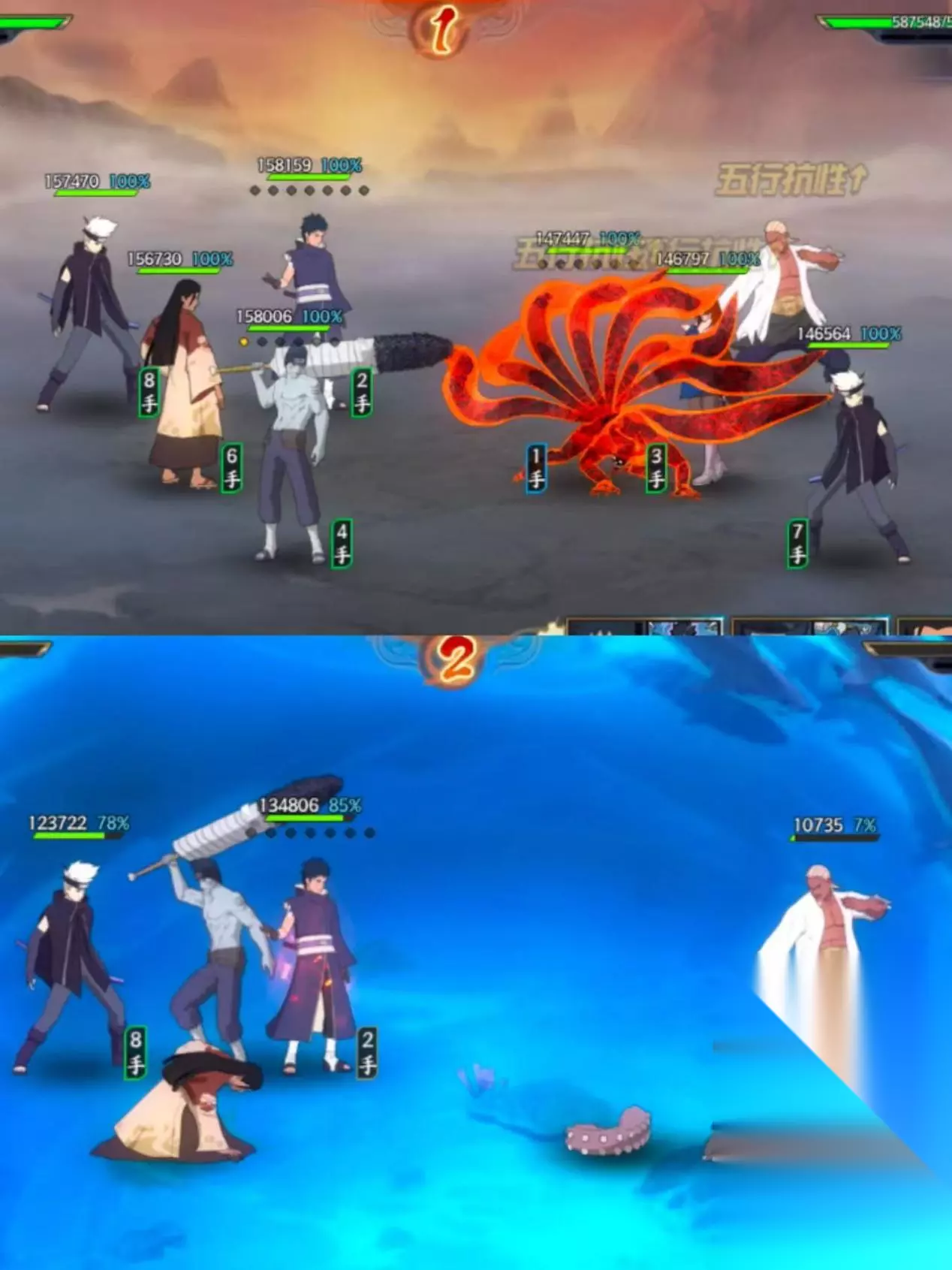 敌方阵容: 奇拉比[尾兽化]+艾[忍界大战]+照美冥[忍界大战]+雷主 实战解析: 第一回合: 1、我方带土使用奥义,对方奇拉比想打断,被我方带土闪避; 2、我方带土累积能量点; 3、我方鬼鲛奥义,对方照美冥抢先奥义,召唤结界,我方鬼鲛奥义失败; 4、对方雷主奥义,增加普攻次数; 5、对方艾奥义,造成伤害,我方带土奥义查克拉消耗增加; 6、双方完成普攻及追打,回合结束; 第二回合: 1、我方追打击败对方雷主; 2、我方带土使用奥义,被对方奇拉比打断; 3、我方柱间奥义,对方艾使用奥义,我方柱间战败,我方获得火之意志,普攻次数和属性攻增加; 4、我方普攻及追打击败对方照美冥; 5、我方带土普攻击败对方奇拉比; 6、我方鬼鲛普攻击败对方鬼鲛,我方赢得胜利。 阵容二(斗祭/竞技场):