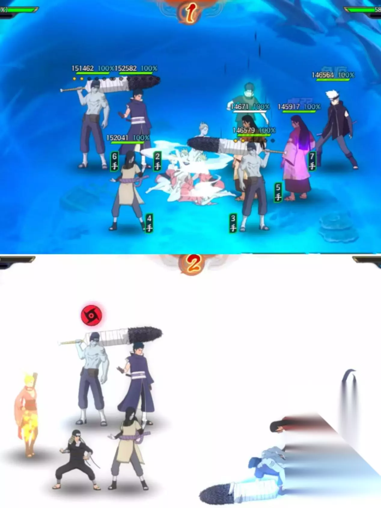 阵容优点: 1、查克拉充足; 2、拥有多次结界与免伤效果; 3、可将对方忍者移出战斗; 4、能多次治疗我方单位; 5、拥有多次普攻及属性攻加成; 6、小队忍者成长较好。 阵容缺点: 1、需要普攻或受击后才有充足查克拉,可能影响奥义顺序策略; 2、需要我方和服柱间战败才有普攻及属性攻加成; 3、结界会相互覆盖,可能会把更有战略作用的结界顶掉。 (一)实战分析1(斗祭)