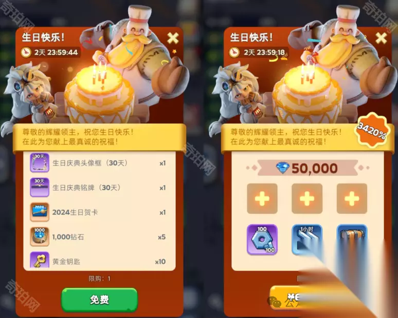 触发条件: 玩家开启领主装备。 购买建议: 领主装备礼包值得购买,尤其在前期,领主装备的材料相对稀缺。 七、生日礼包