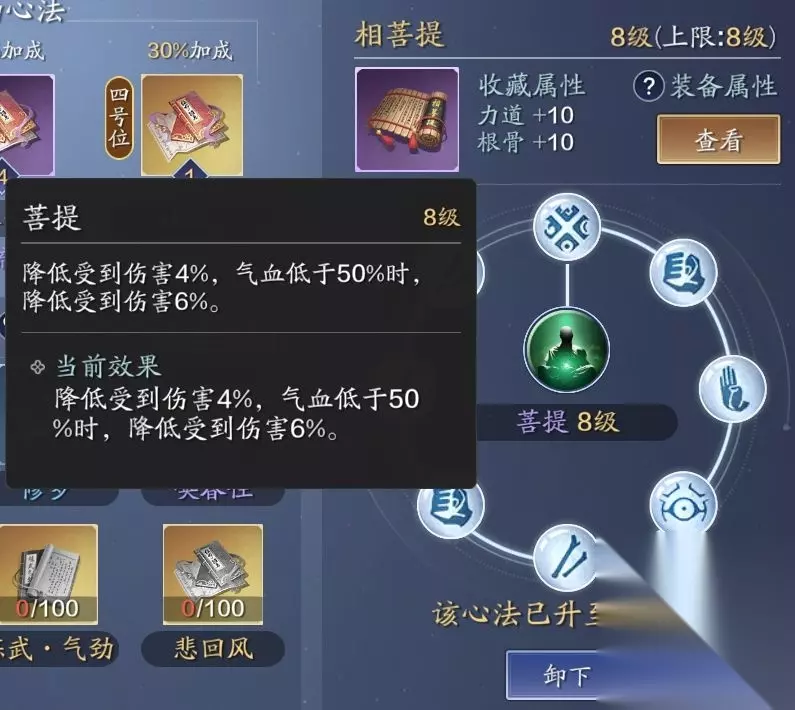 二、推荐缘由 作为一名拥有两种形态、各项属性较为均衡的角色,真武当以提升个体的输出强度、保命效果为方向,即: 1、杀菩提:保命性心法,即真武气血降低至50%或以下时,将自动触发减伤效果(最大10%)。简单来说,心法等级越高,后续获得的减伤效果越强,也就能坚挺更长时间; 2、悲回风:提升真武的输出强度,即一者增加职业外功攻击、洞察和力道,二者在破定目标后打出额外的输出效果。注意,为使心法效益提升至最高,建议升级心法; 3、淬火流毒:控制和持续伤害类心法,即:一者迫使目标中毒,在限定时间内不断掉血;二者迟滞目标,使之无法对玩家构成有效的威胁;三者降低敌人的生命恢复效率,提高作战容错率; 4、炼武洞察:提升职业的会心、命中和洞察效果,为职业后续的高额爆发提供基础保障。