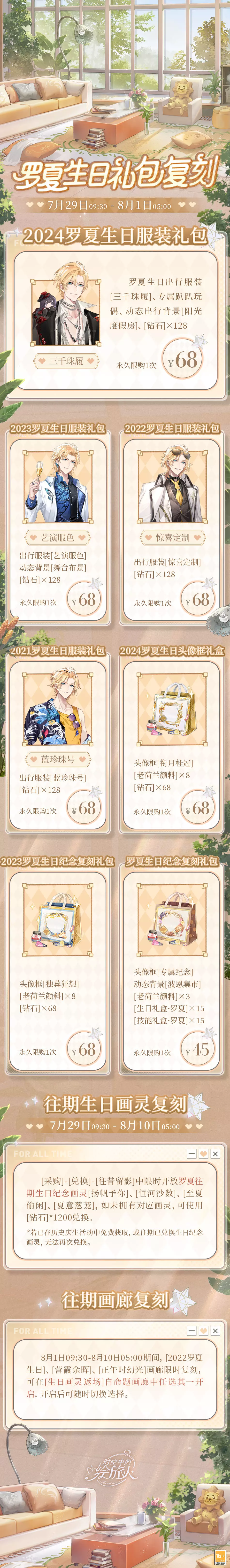 ★7月29日09:30 - 8月1日05:00,罗夏往期生日服装礼包、[罗夏生日纪念复刻礼包]、[2023罗夏生日纪念复刻礼包]、[2024罗夏生日头像框礼盒]限时返场,欢迎前往[采购]-[生日复刻]选购。