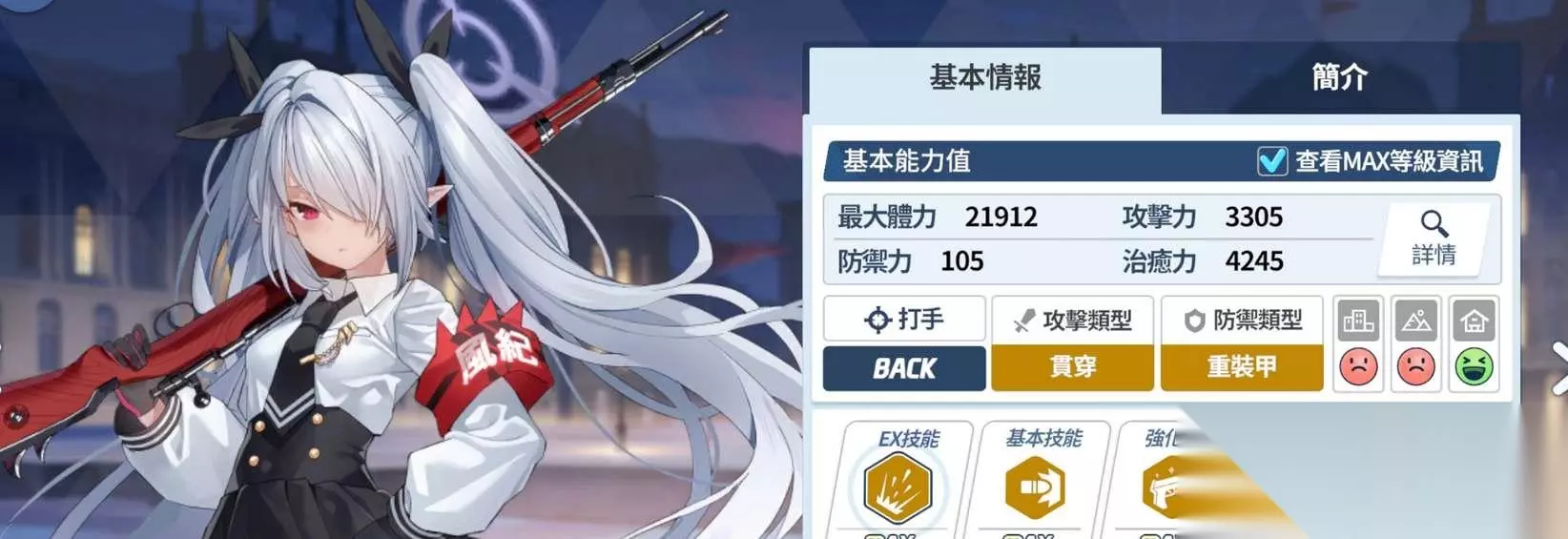 技能解析: 发射3颗子弹攻击单个目标,并对目标后方圆锥形区域内敌人造成范围伤害。 兼具单体爆发与AOE清理能力,适合应对分散站位的敌人。 建议用于优先击杀高威胁目标(如BOSS)并波及小怪。 2. 持续输出:普攻「暗黑狙击」 核心数据: 每25秒触发一次,造成229%~436%攻击力的单体伤害。 频率适中且伤害稳定,可作为持续输出主力。 3. 被动强化:「社长的威严」 增益效果: 提升自身命中率,减少攻击落空风险。 对高闪避敌人场景尤为关键,建议搭配命中率装备强化。 4. 进阶机制:辅助技能「法外狂徒的作风」