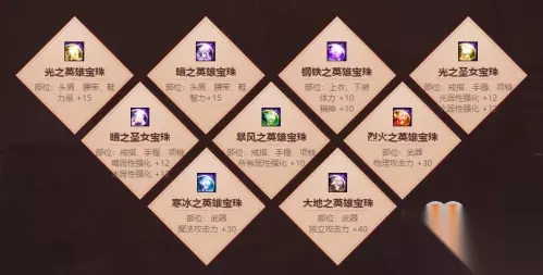DNF天命英雄宝珠礼盒宝珠属性 DNF天命英雄收集箱加成属性一览,玩家可获得天命英雄宝珠礼盒,打开宝珠礼盒可获得宝珠,并有天命英雄收集箱系统加成,下面小编就为大家分享DNF天命英雄宝珠礼盒详情,一起来看看吧。 DNF天命英雄宝珠礼盒详情 天命英雄宝珠礼盒获得方法:购买神选之英杰礼包可获得1个【天命英雄宝珠礼盒】,打开后可以从以下9种宝珠中任选一个; 天命英雄宝珠可以放入宝珠收集箱,可以交易,无删除日期。 天命英雄宝珠礼盒内容 光之英雄宝珠 部位:头肩、腰带、鞋,力量 +15 暗之英雄宝珠 部位:头肩、腰带、鞋,智力+15 钢铁之英雄宝珠 部位:上衣、下装,体力 +10,精神 +10 光之圣女宝珠 部位:戒指、手镯、项链,光属性强化 +12,火属性强化 +1 暗之圣女宝珠 部位:戒指、手镯、项链,暗属性强化 +12,冰属性强化 +12 暴风之英雄宝珠 部位:戒指、手镯、项链,所有属性强化 +10 烈火之英雄宝珠 部位:武器,物理攻击力 +30 寒冰之英雄宝珠 部位:武器,魔法攻击力 +30 大地之英雄宝珠 部位:武器,独立攻击力 +40
