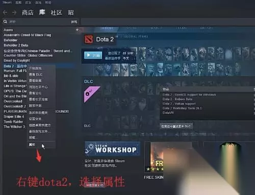 3.然后我们回到Steam的主界面,右键单击dota2选择属性。如下图所示