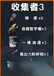 收集者-3 喷漆(非绑定) x8 一桶油漆(非绑定) x3 自旋型手锯(非绑定) x3 高出力粉碎钳(非绑定) x3 电动车电池(非绑定) x2