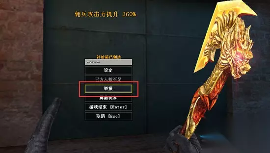 游戏内:常规举报 1. 按ESC之后,会弹出主菜单,点击主菜单中的“举报”按钮: