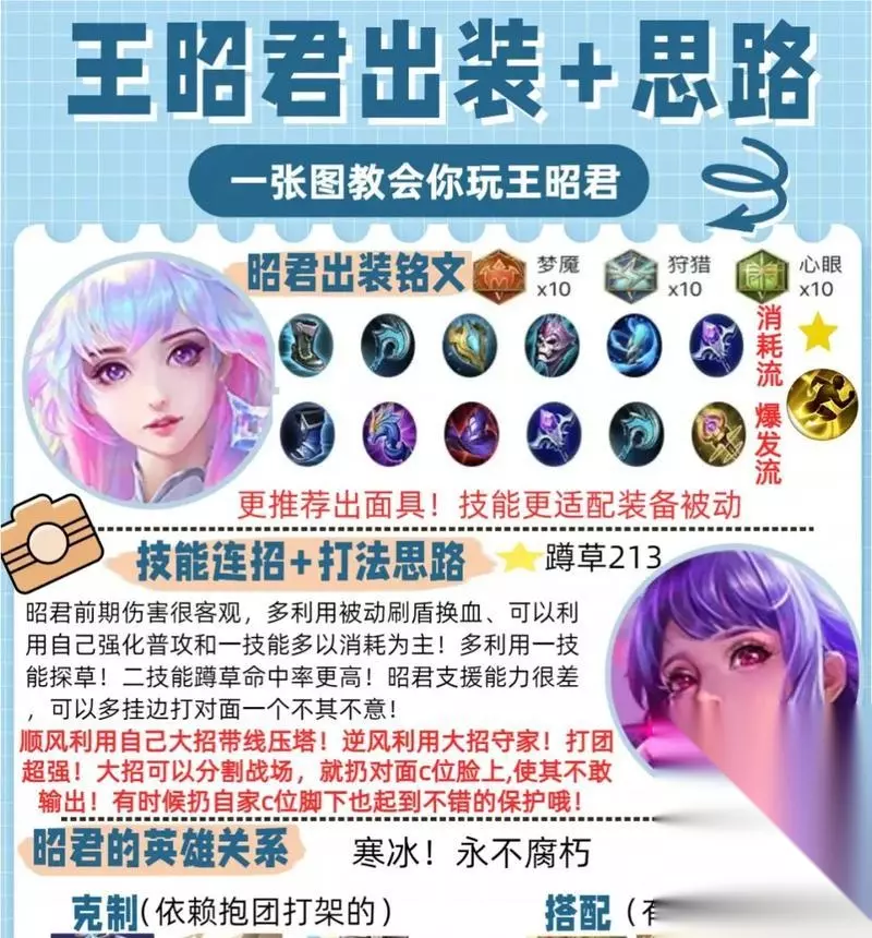 适合的对局与实战运用 面对无位移脆皮阵容 若敌方阵容中脆皮多且无位移技能,王昭君作为辅助可以发挥极大的限制作用。利用二技能和大招的冰冻效果,配合队友轻松赢得团战。 面对持续消耗阵容 在对线持续消耗能力较强的敌人时,王昭君的控制与反手能力能为队友提供很好的支援,尤其是在守塔和反攻时有显著效果。 结语 综合以上,王昭君作为辅助的打法技巧讲究的是对技能的精准释放和对局势的敏锐洞察。无论是对视野的控制、游走的时机还是团战中的定位,都需精准判断。掌握好这些技巧,并了解适合的对局,您将能更有效地发挥王昭君作为辅助的潜力,为团队取得胜利。 通过以上内容的介绍,相信您已经对辅助流王昭君有了全面的了解。在实战中不断磨练这些技巧,您将能在《王者荣耀》的战场上展现出卓越的辅助能力。