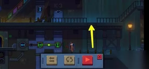 把传送带调成图示后,按下开始键 吓走坏人,就可以从楼梯口上去了