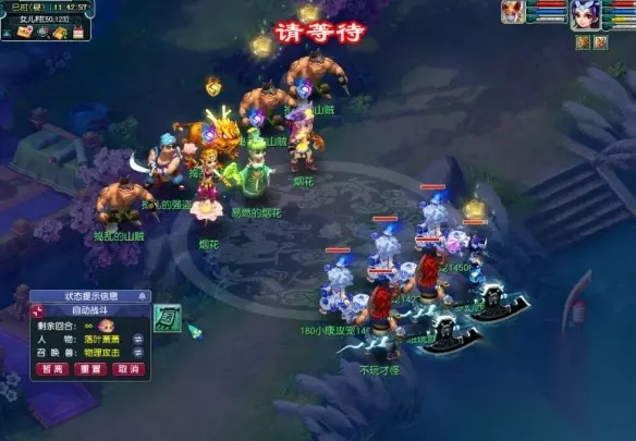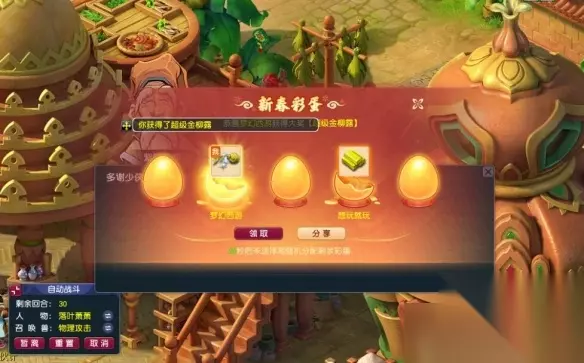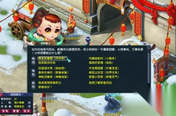3、完成一个环任务将获得一点作战熟练度(需提前领取年兽宝宝)熟练度达到80即可让年兽宝宝托管战斗; 4、环任务自动战斗时支持在战斗内使用巫医和酒肆,当出现气血或魔法不足情况时会提醒玩家。
