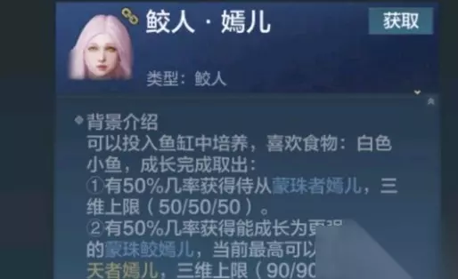 【妄想山海人鱼侍从介绍】 鲛人月落 美人鱼鱼苗投入鱼缸中培养,喜欢食物:白色小鱼,成长完成取出。 1、有50%几率获得侍从蒙珠者月落,三维50。 2、有50%几率获得蒙珠鲛月落,三维90。 鲛人嫣儿 美人鱼鱼苗投入鱼缸中培养,喜欢食物:白色小鱼,成长完成取出。 1、有50%几率获得侍从蒙珠者嫣儿,三维50。 2、有50%几率获得蒙珠鲛嫣儿,三维90。