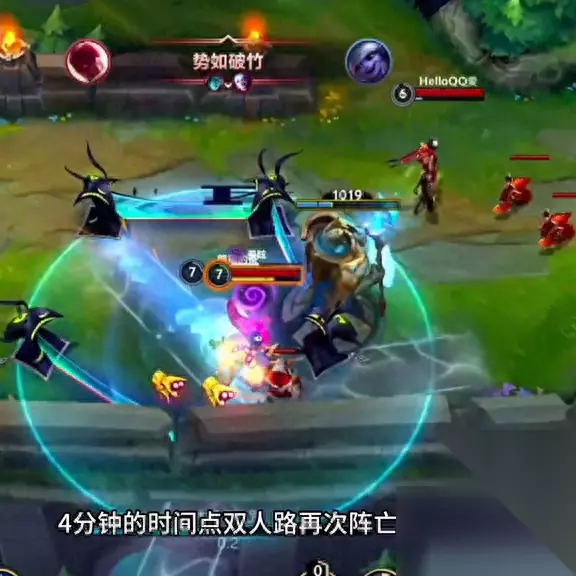开局后,我在1分33秒出野区,刷了6组野怪,并利用q小兵a闪的技巧,成功收掉了卡牌的人头。2分10秒,我发现红蓝buff都在瞎子身上,而且他正在上路,因此可以确定他一定是蓝开往上刷的。回到家中后,我准备直接进入瞎子的野区反野,但刚好看到卡牌在压制石头人,于是我直接三技能偷掉了卡牌的人头。 在4分钟的时候,我和队友再次阵亡,但在路反蹲时,我利用QRE打一套瞎子,但他居然有闪现让他跑了。