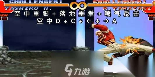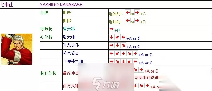 5、 喷气反击:←↓→+A或C 6、 百万大锤蒸汽:↓←↓→+A或C 7、 最终冲击:↓→↓→+A或C ……乖乖地安睡吧! 二、拳皇97七枷社连招教学 连招1:空中D+C+←↓→A 解析:接近敌人后多段攻击,伤害不错,可以击飞敌人。