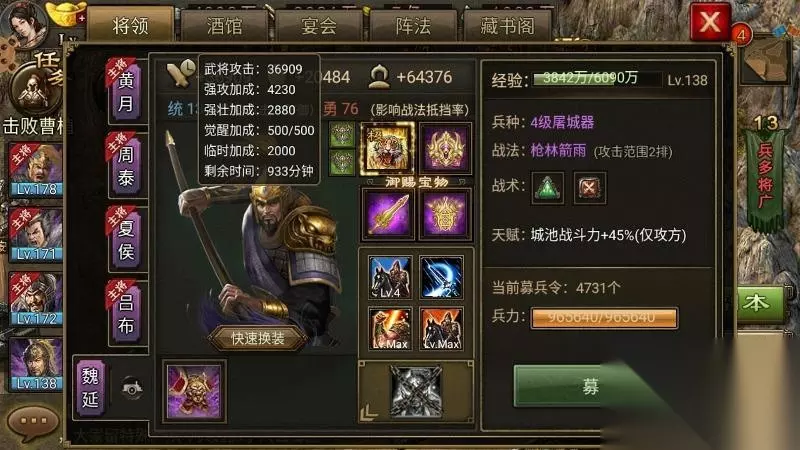 选择合适的辅助武将对于提升战斗力和推图效率非常重要,在选择武将的时候,尽量搭配自己当前需要的。早期因为我们输出能力不强,因此我们尽量要搭配防御型的辅助武将使用。最推荐的就是魏延,它的统力值较高,特别适合用于攻城任务,能够有效减少城防对部队的伤害。且魏延是蜀国武将,加上蜀国是开荒的最佳阵营,所以选择魏延的玩家是最多的。典韦在搭配霸下套装后,防御能力大幅提升,能够在战斗中承受大量伤害,是防守战中的重要角色。