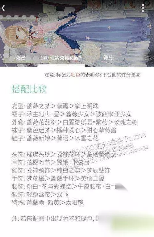 现实交错花园1高分S搭配 《暖暖环游世界》现实交错花园再度来袭,在时隔几个月之后,这个活动又再度和玩家们见面。现实交错花园怎样搭配才能获得高分呢? 现实交错花园高分S攻略说明: 1. 标记为红色的表示iOS上该项物件分更高,望能有帮助。 2. 由于卖号了,所以每张攻略图没有得分;比起图片,愉快的看文字吧。 3. 请勿盗用攻略。我知道我和cc写的高分讲堂已经被盗用了。 4.花园3没有高分!!!别用错关结果变F了。 5. 关号我乱标的,不要在意,我记不到花园1是169还是191了。 现实交错花园1高分S搭配