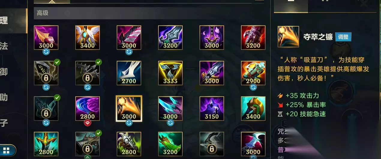 3. 幻影之舞:攻速触发的闪电革命 幻影之舞移除了最令人诟病的启动条件,灵活性大幅提升: 取消预热!瞬间启动:恼人的"普攻四次后才能获得攻速"的限制被彻底删除! 一击即发:现在,你只需普攻敌方英雄一下,立刻就能获得幻影之舞的额外攻速加成! 暴击续航:在攻速加成持续期间,你的每次普攻暴击都会延长此效果1秒持续时间。 冷却与缩减:如果效果结束时未能通过暴击刷新延长,则会进入20秒冷却。在此期间,你的每次普攻(无论是否命中英雄)都能减少该冷却时间1秒。 定位转变:虽然触发门槛大大降低(摸到人就行),但想要维持长时间的高攻速状态,依赖暴击刷新意味着它在前期(暴击率低时)收益有限,更适合作为中后期的攻速暴击选择。 4. 夺萃之镰(吸蓝刀):技能与普攻的华丽共舞 夺萃之镰舍弃了旧版强化单次技能的设计,拥抱了更流畅的作战循环: 移除"咒刃":不再提供"下次攻击或技能造成额外伤害"的效果。 全新"充能"机制:改为使用技能后获得充能(类似于旧版太阳刀的机制)。 普攻引爆充能:当你普攻命中敌人时,会消耗一层充能,造成额外物理伤害并为你提供短暂的移速提升。 装备融合:这标志着太阳刀(斯塔缇克电刃)的移除,其核心被动效果被整合进了新版夺萃之镰。 定位明晰:新版夺萃之镰一跃成为技能穿插普攻型英雄(如卢锡安、EZ、卡莎)的顶级神器,每一次技能与普攻的衔接都能打出额外爆发和机动性。 峡谷新格局: 饮血剑化身攻守一体的保命核心,无尽之刃彻底解放了暴击装的搭配上限,幻影之舞告别了笨拙的预热过程,夺萃之镰则完美继承了太阳刀的衣钵。这四大神装的重做,宣告着暴击体系英雄的玩法将迎来前所未有的灵活与强度!准备好用它们主宰峡谷了吗?新的暴击时代,已经降临!