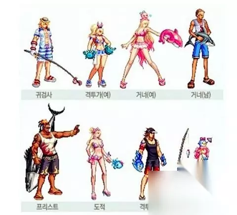 09年的海之勇者时装发售时还只有5个角色,可以看到做的还是有些细节的,男圣职和男鬼剑的上半身的纹身让时装不会太单调,女格斗垂下来的丝带很好的遮挡住了显胖的大腿。男角色穿拖鞋女角色裸足也更符合性别特色,可以说真的是用心去做了。 2010海之勇者系列: