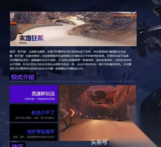 末路狂飙,唯一一个不会死的挑战.. 虽然”炽天使”之战极为艰难,但是GRX精英队员们依然完成了任务。Blitz看到他们最强的生化武器‘炽天使’也被击败时,决定搭乘直升机返回他们沙漠峡谷之中的秘密实验室。可是Blitz却不知道GRX精英队员们一直隐蔽的在后方追踪,正当Blitz准备使用‘极速滑板’返回实验室时,GRX队员突然从天而降。队员们对这次的伏击势在必得胜负在此一举。这也许是将Blitz一网打尽的最好时机。GRX精英队员们要将Blitz和他们的生化兵器一起埋葬在沙漠峡谷之中。 现在变成刷经验图咯,还得是土豪才能刷,这张图注意可以跳的,所以被卡住了跳一下就行,还有就是墙的2个buff倒是蛮好玩的