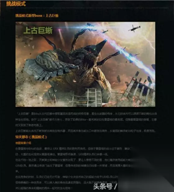 最后一张地图,目前最热的巨蜥峡谷(喵的这鬼蜥蜴真tm命大) 地图背景:生物军团的攻击下,空中航母最终坠落在巨蜥峡谷。在GRX的保护下,空中航母进行了艰难的迫降,但是几乎已无法修复。GRX们冒着生命危险,潜入峡谷保护空中航母并等待救援。为了自卫,他们把干枯峡谷的废水力发电厂建造成最后防线。就在这时,超巨型生物体兵器——生化巨蜥突然向他们突袭…