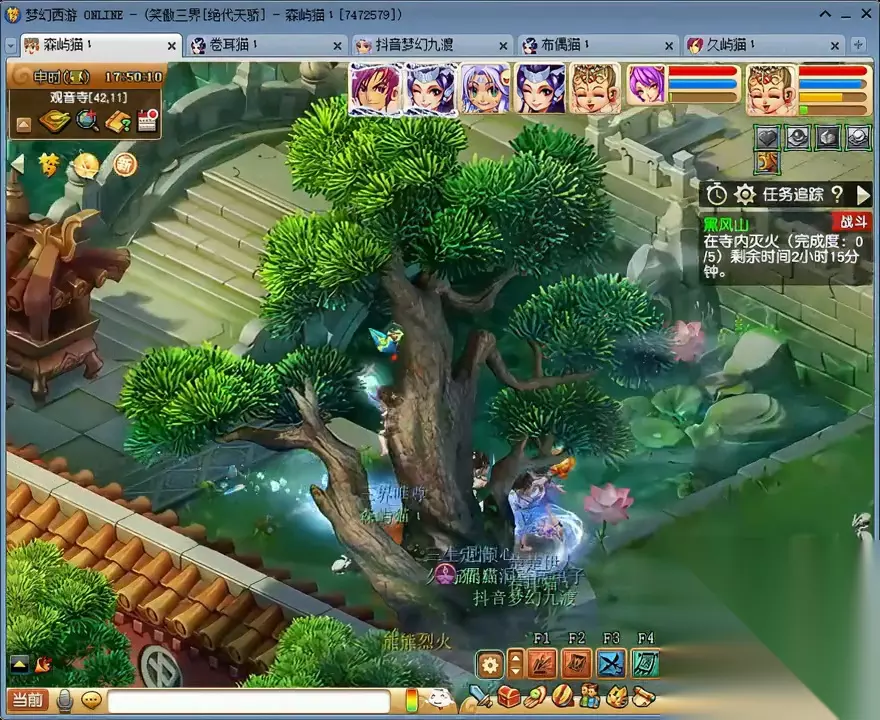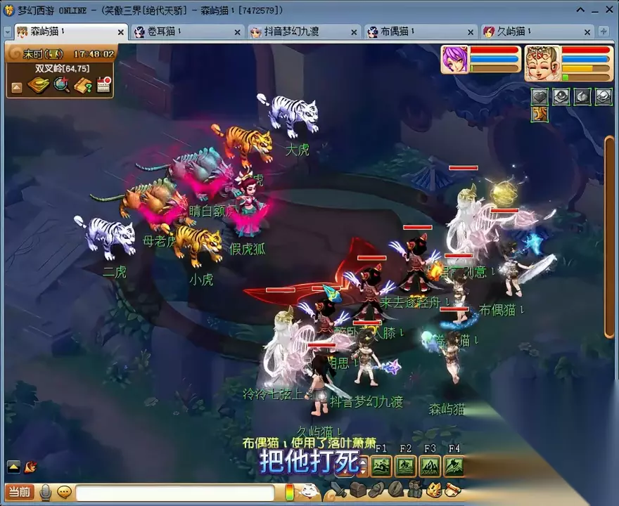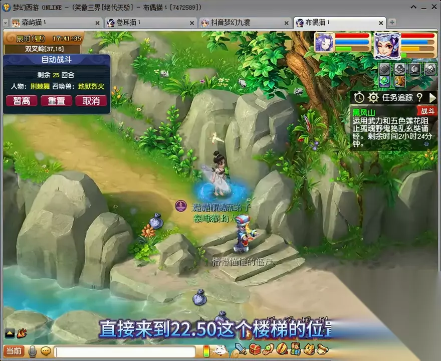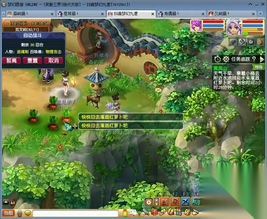 第二,在摘菜任务中,有一个打水任务。可以直接在85.72这个位置使用木头来完成打水任务,不用跑太远。完成所有单人任务后,输出最高的四个号来到37.16这个位置,留下一个号去捡花。即使怪物移动了一格,也可以在这个位置点击。 进入战斗后,这个号就不用管了,直接切换下一个号。如果有物理输出,尽量选择马面或野鬼;如果是固伤输出,尽量选择牛头;如果是法系输出,尽量选择牛头,这样可以提高击杀速度。 捡花的号捡了二十几朵花后,直接来到22.50这个楼梯的位置。如果我的号速度较慢,可能会漏怪。在这个位置,即使漏怪了也可以直接堵住,身边也会重新刷新花,可以一边捡一边扔,全部完成。完成后,我们重新组队来到山顶。这里有两种战斗选择,一种是找婆婆,相对简单;另一种是找镇山太保杀雌雄双虎,相对困难,但奖励更好。其实也不难,因为主怪可以被封印。在第二回合主怪出手之前把它打死就可以了,或者第二回合封住。两只老虎全部变身了,主怪的速度也比较快。第二回合,女儿村要给力,两回合结束。然后我们进入化生寺地图。进入地图后,先找到鬼鬼祟祟的黑熊精,它在整个地图上随机刷新。这场战斗最好在一回合内完成,这样奖励会更好。获得几个碧藕和一个盒子。直接进入战斗网,找到熊熊大火,然后使用AIT+A进入。这场战斗的难度相对较高,对手的法术伤害比较高,而且主怪还带有火属性吸收能力。不过,我通常只需要两个回合就能完成五场战斗。