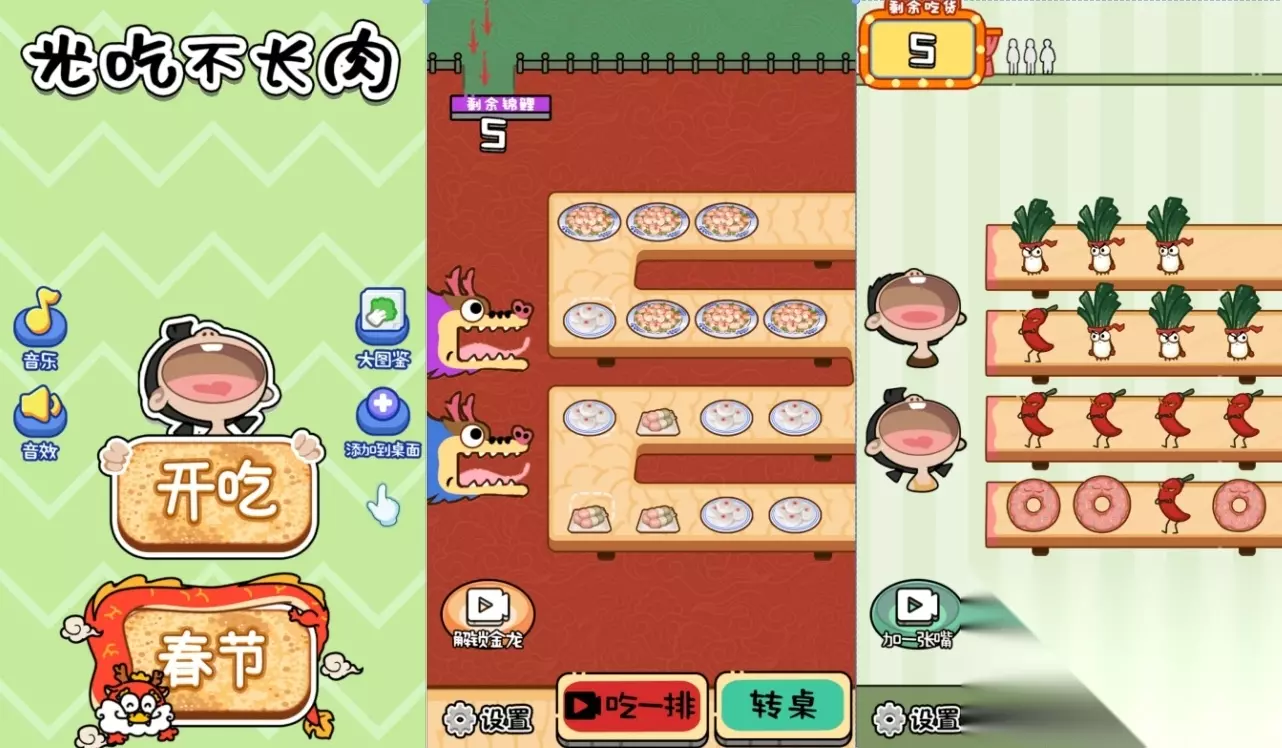 玩家将操控拥有大嘴巴的美女大胃王对各种食物进行狼吞虎咽,整体画面清新明亮,同时拥有多种角色形象和食物种类供你自由选择,随着吃下食物数量的增加,界面上方进度条也会推进,推进到满值后即可视为挑战胜利,因此在玩法和操作上都相当简单明了,并且关卡过程中还可通过娱乐一下选项进入消除小游戏放松休闲,缓解通关压力。 高速下载 普通下载 优先233乐园APP下载 4、《光吃不长肉》