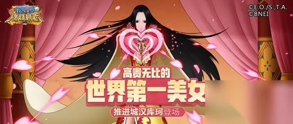 她是男子禁入的女儿国“亚马逊百合”的皇帝,同时也是九蛇海盗团的船长。没错!她就是被人称为绝世美女的“海盗女帝”——波尔·汉库珂。 曾被迫吃下恶魔之果,从而拥有着能将男女老幼尽数迷倒,并将对方变成石头的能力的汉库珂此前曾一度以她超高的爆发输出能力与强力群体控制称霸天梯。 而本次,SSR推进城汉库珂将以因佩尔地狱时期的造型再次登场,不论是技能强度还是属性相较以前都有了较大幅度的提升。