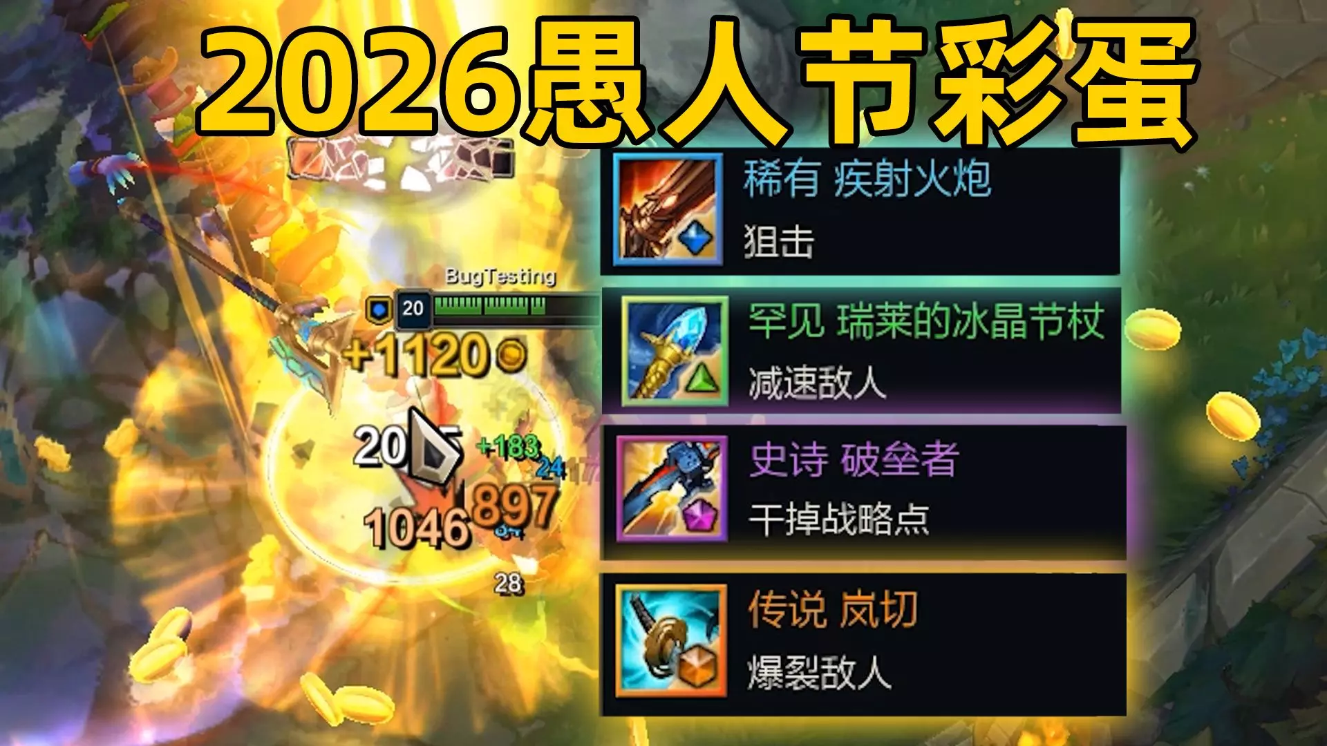 这是LOL全新愚人节彩蛋预览,包含魄罗可打人、小兵爆金币、大乱斗能放烟花等趣味内容,还有全新装备“金色财运”会周期性掉落黄金硬币,另有免费药水带来隐藏技能栏、血条变色等特殊效果,趣味十足。