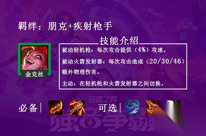 金克丝介绍 金克丝的技能是在2个被动技能(叠攻速和额外伤害)之间切换,搭配上朋克羁绊(生命值和攻击力)的叠加,后期输出非常爆炸。装备选择必备:鬼索的狂暴之刃(羊刀)、卢安娜的飓风(分裂弓),可选装备:巨人杀手、死亡之刃、无尽之刃。 【阵容推荐】