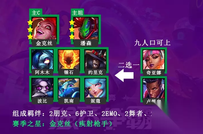 阵容一 【推荐阵容一】:金克丝{主C+赛季之心(疾射枪手)}、潘森(主坦)、阿木木、锤石、约里克、波比、凯南、妮蔻八人口组成。 【构成羁绊】:6护卫、2朋克、2EMO、2舞者、2疾射枪手。 九人口可上奇亚娜凑2真实伤害或上卢锡安作为副C。