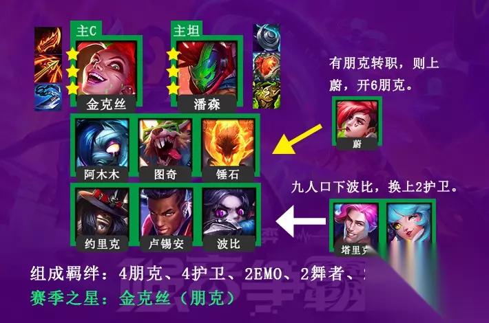 推荐阵容二 【推荐阵容二】:金克丝{主C+赛季之星(朋克)}、潘森(主坦)、阿木木、锤石、约里克、卢锡安、波比、图奇八人口组成。 【构成羁绊】:4朋克、4护卫、2EMO、2舞者、2疾射枪手 九人口替换下波比,上塔里克和妮蔻组成6护卫增加前面坦度。 如果有【朋克转职】,则可以将波比替换成蔚,开6朋克,伤害跟坦度都可以得到质的飞跃。 【装备推荐】
