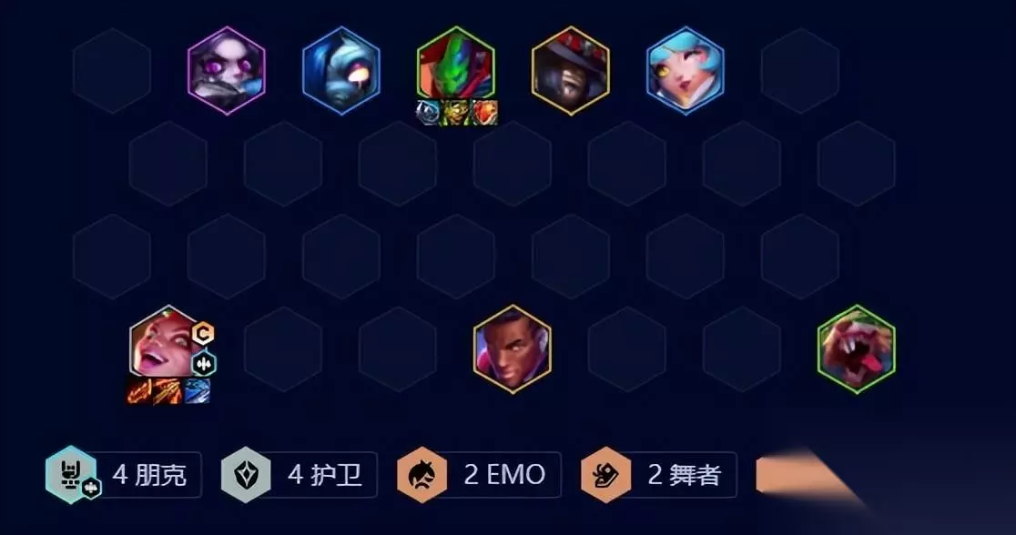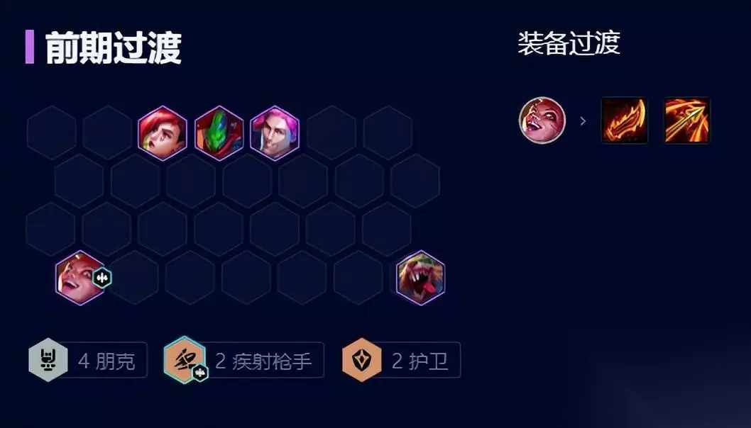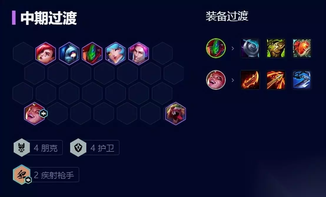 中期过渡 中期由于朋克羁绊,每回合第一次刷新只要1金币并可叠加(朋克成员)属性,利用这一次D牌提升整体质量,等6人口后可追三星潘森并补上其他护卫。