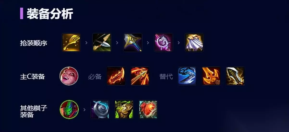 后期阵容 后期8人口后可先提升一波其他卡牌的质量,然后再快拉9人口并找到需要的5费卡并替换上护卫凑齐6卫护,让前排的坦度有明显的提升。 总结,这套阵容金克丝、潘森必须追三星,且金克丝必备羊刀和分裂弓、潘森必备薄暮法袍。成型后,金克丝的伤害高到爆炸。当然如果对面有死歌加阿卡丽阵容的话,金克丝可以带一件吸血装备,确保不会被秒。今天的介绍就到这里,学会的小伙伴赶紧拿去上分吧。
