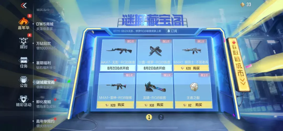 谜城藏宝阁上新AK47-无影-RGB骇客与沙鹰-修罗-RGB骇客皮肤,返场不屈老兵、RGB骇客多款皮肤,点击下方页码可以翻页,CFer们也不要错过了第二页的皮肤,谜城币有富足的CFer还可以兑换王者之骰,很贴心。
