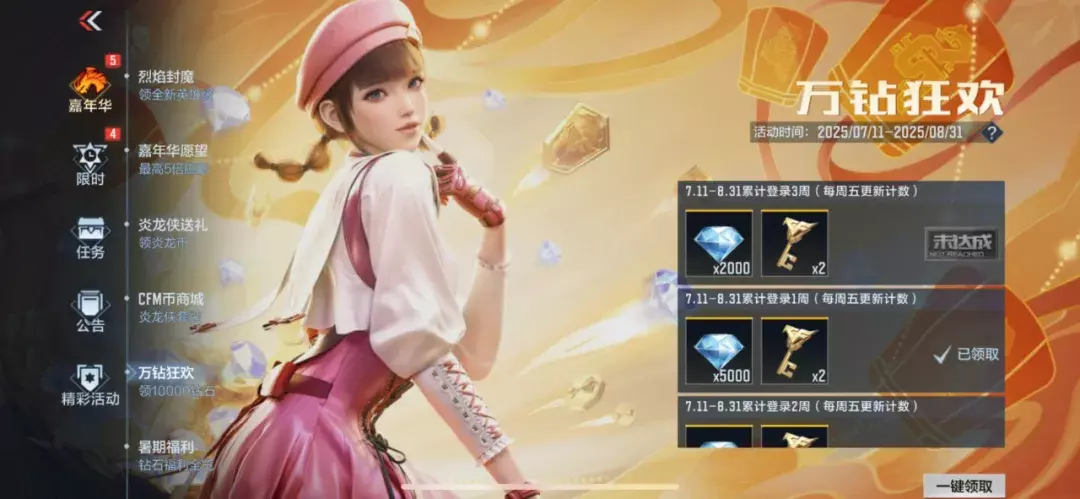 累计登录3周即可领取10000钻石和6把英雄之钥!累计登录每周五更新计数,前面两周都参与的CFer本周五即可领取全部奖励。