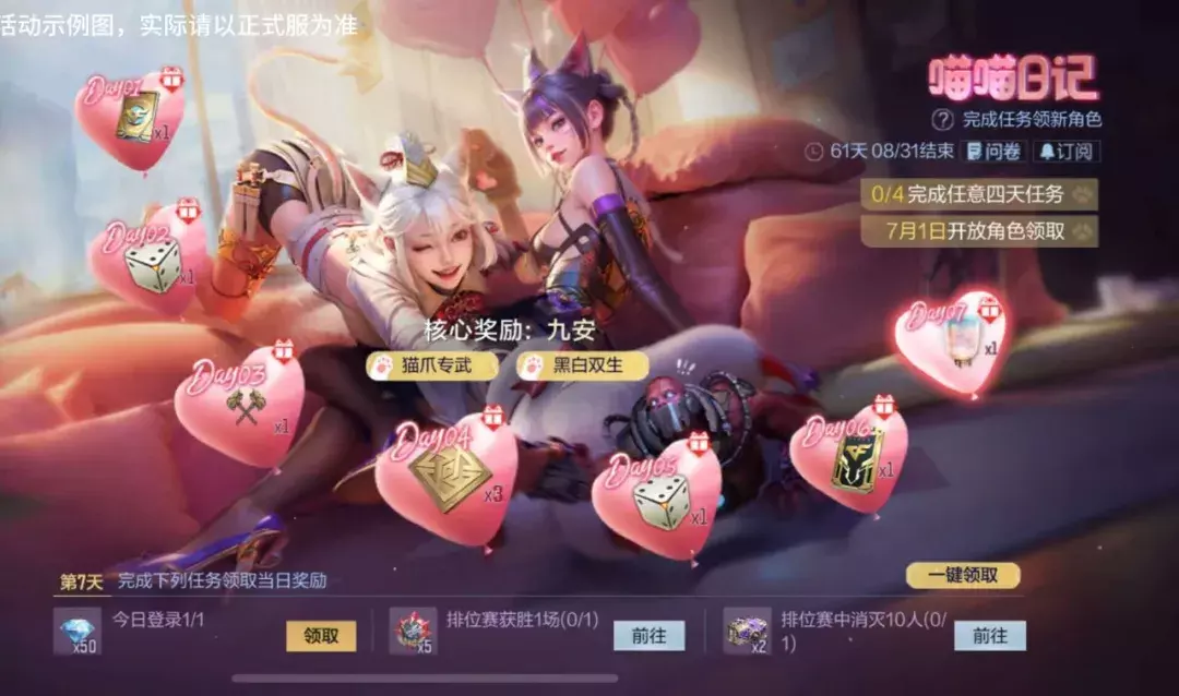 超萌猫系少女九安作为一款福利角色上线啦!获取方式与之前的福利角色类似,完成任意4天任务,即可免费获得九安。这款角色拥有防摔和防雷双防属性,如果你非常喜欢这款角色,还可以将其觉醒为九安-X,额外洗炼两条实用技能。