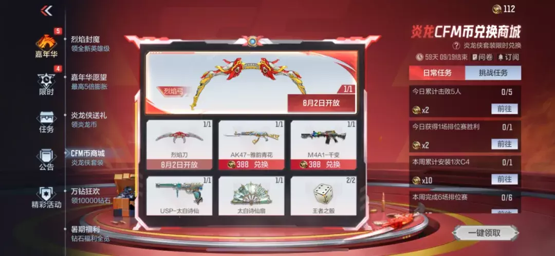 炎龙CFM币商城可以获取炎龙铠甲套装的副武器烈焰弓与近战武器烈焰刀,这两款道具于8月2日解锁兑换,大家的炎龙CFM币都存了多少啦?目前可以兑换AK47-雅韵青花、M4A1-千变等道具,喜欢这些道具的CFer不要错过此次返场。