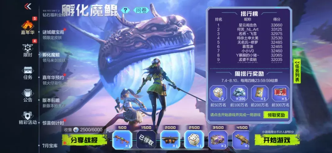 完成任务获取一定积分,积分达到6000时可直接领取马来剑-毁灭-现代金属。完成小游戏还可以参与排行榜,本周你可以领取到哪个档位的排行榜奖励呢?