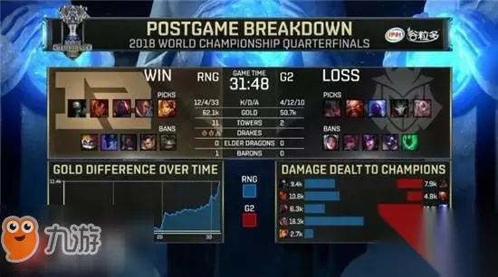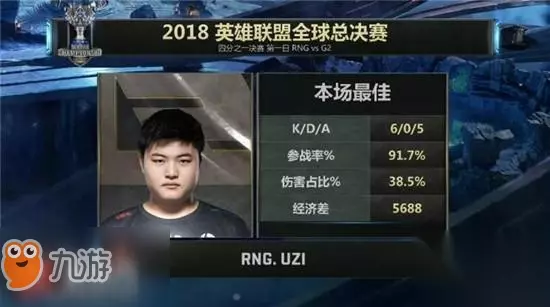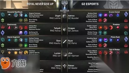 赛况简介: 3分钟Jankos抓下,Hjarnan接上伤害拿下一血;前期RNG几波前期节奏都遭到反制,Letme也被G2双人越塔抓死,但Uzi凭借对线人能力连破两塔,RNG拿下峡谷先锋,而G2通过避战换塔死死咬住经济;但20分钟RNG在野区依靠Ming果断先手,Uzi疯狂输出助RNG完成0换4,瞬间拉开4K经济;中期RNG四人抓死瑞兹后控下第二条土龙,并于28分钟Rush大龙成功,推进过程中Ming再次果断先手完成2换2,RNG击破上路高地塔,经济差距已达到8K;29分钟RNG带着大龙Buff尾声进攻G2高地,剑魔回防不及被RNG平推中下两路高地,逆境中的G2企图强开却遭遇RNG强势反打,一波0换4后RNG成功终结比赛。 【Ban/Pick】