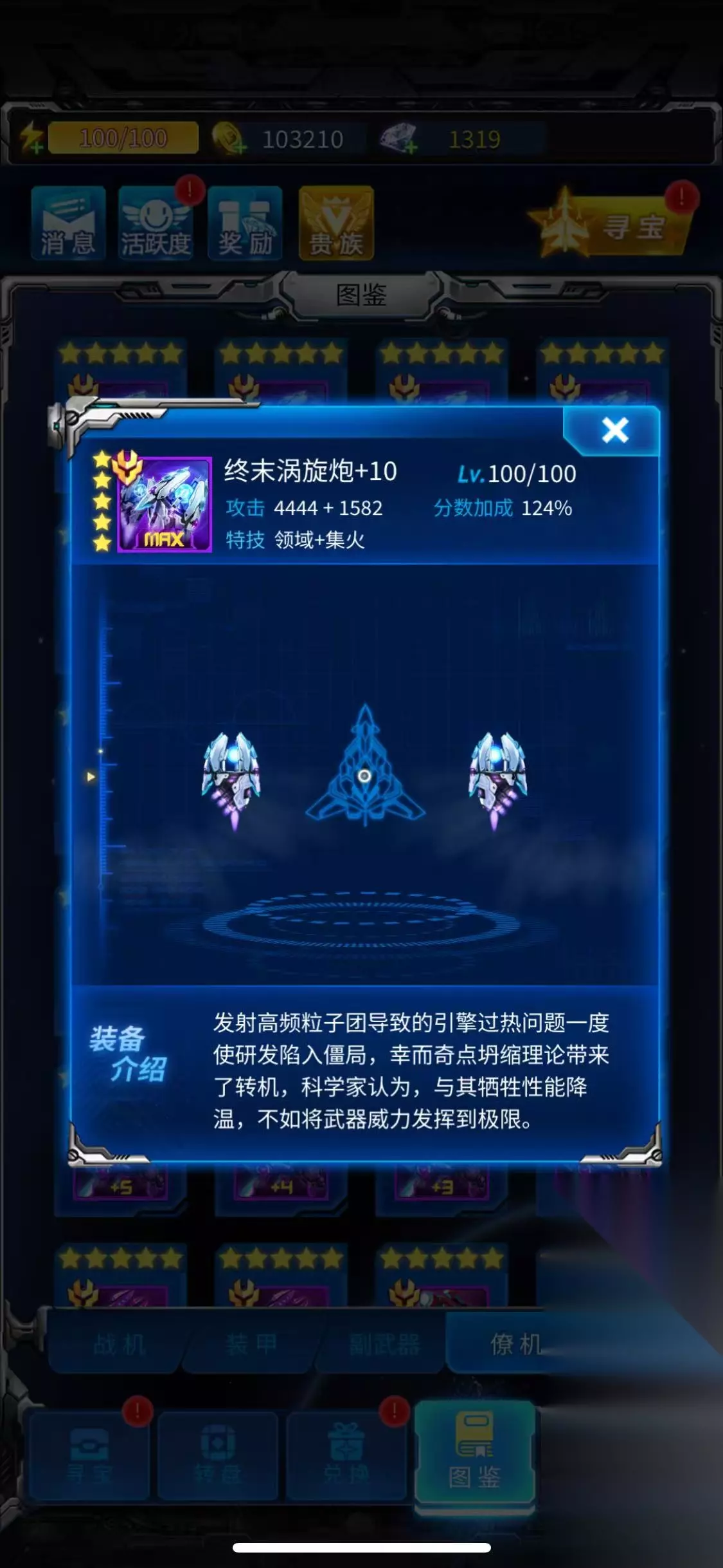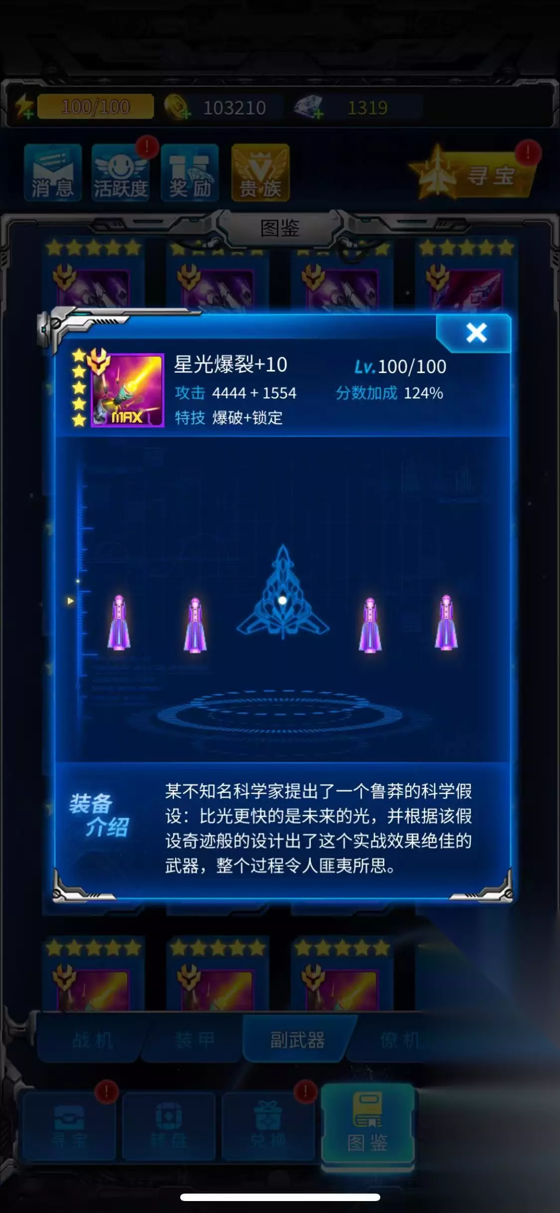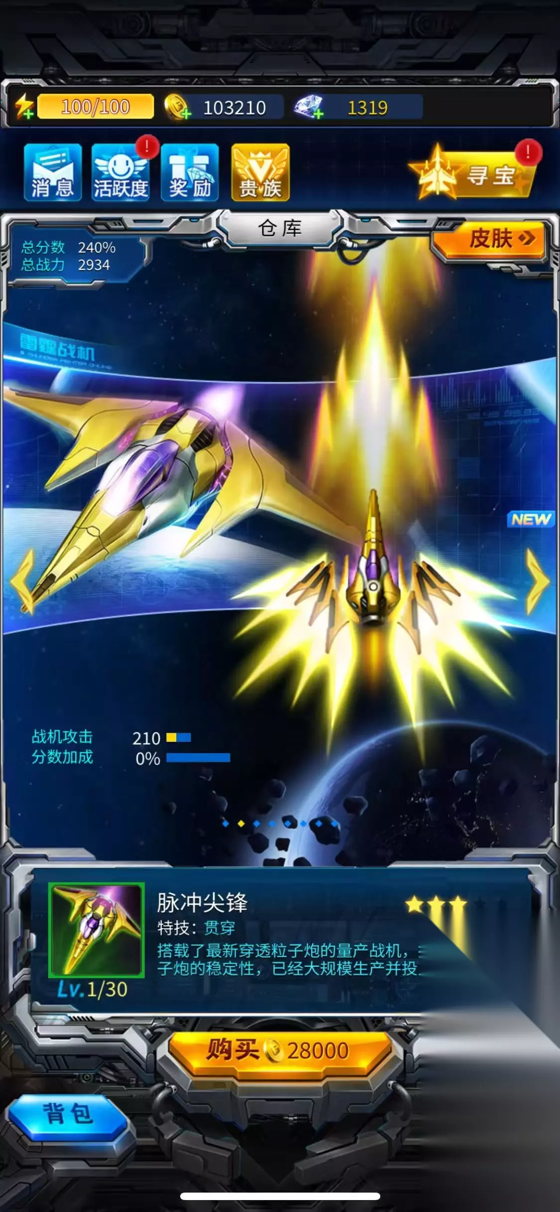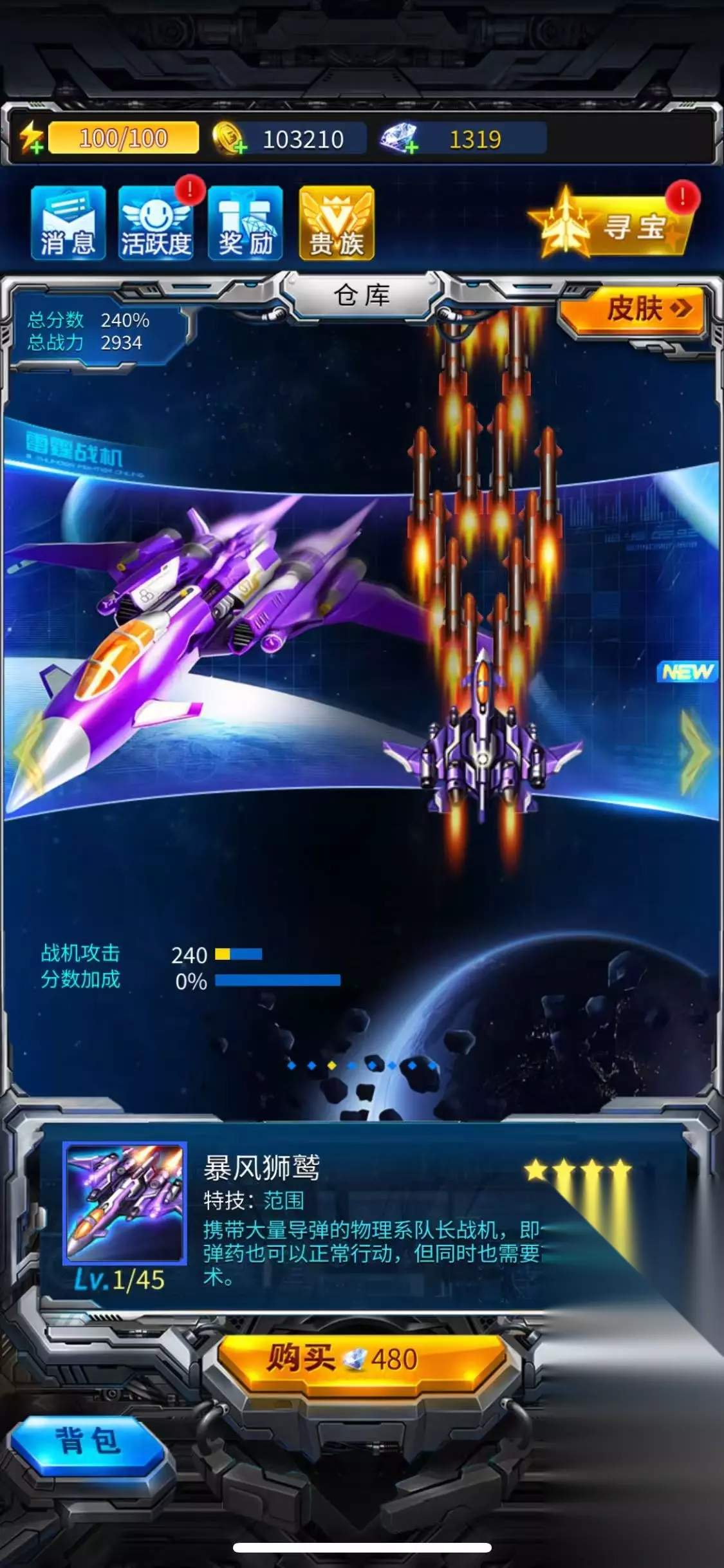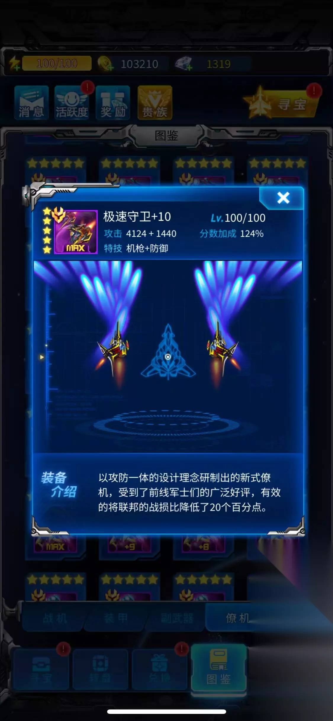 中后期: 主力战机:推荐暴风狮鹫,范围攻击大,能有效压制敌群,在无尽模式和特殊关卡表现出色。 装备搭配:将暴风狮鹫培养到紫色品质后(可以直接用钻石购买),搭配守月魔殇(可回血)和星光爆裂副武器(范围攻击+锁定),能实现高效清场。