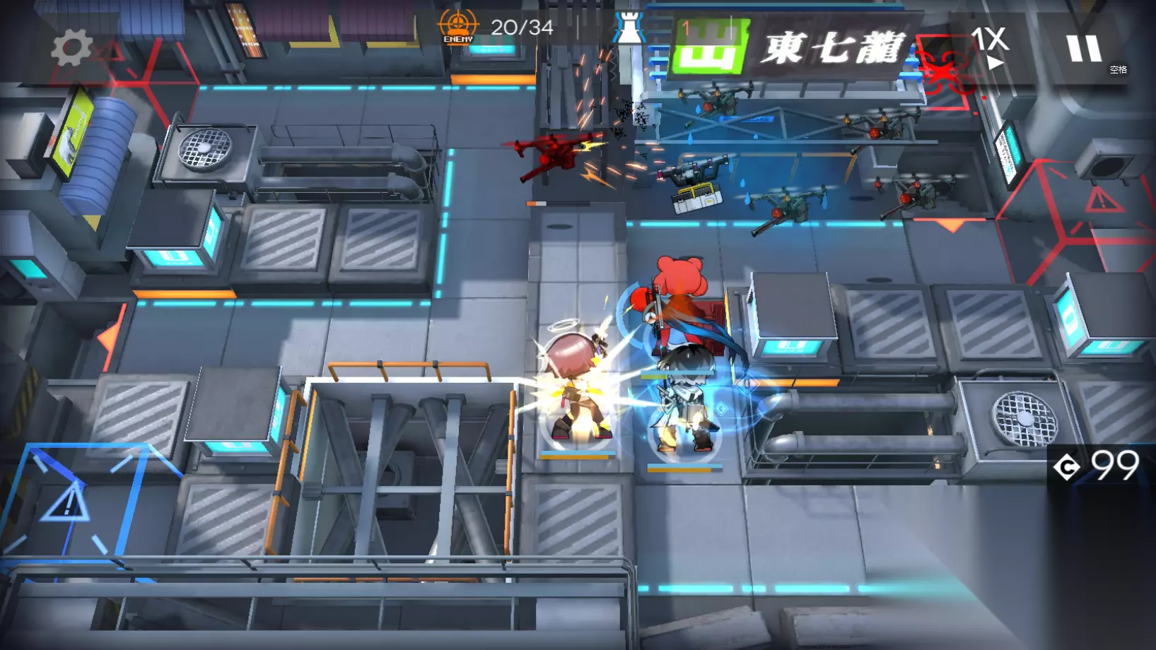 第二波敌人是一群敌方无人机,其中有一个赞助无人机一定要打掉,赞助无人机的移动速度很快,因此在它们进入到能天使和极境技能范围内就同时开启两个干员的技能将它们迅速处理掉。赞助无人机会掉落一个炸弹,我们要用它去处理最后的冬灵血巫大师。