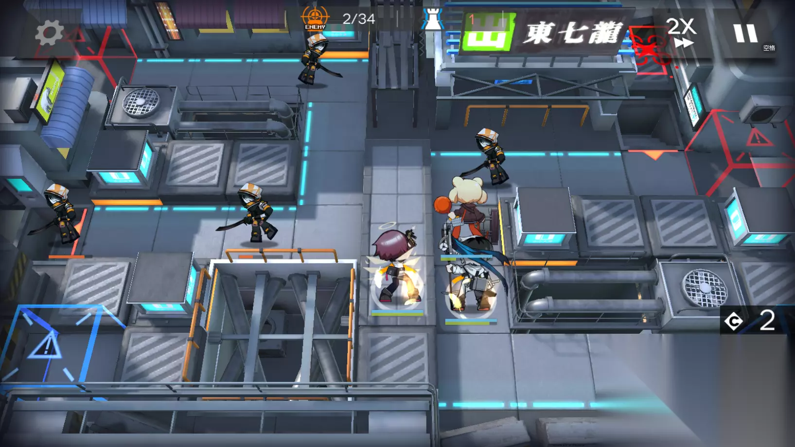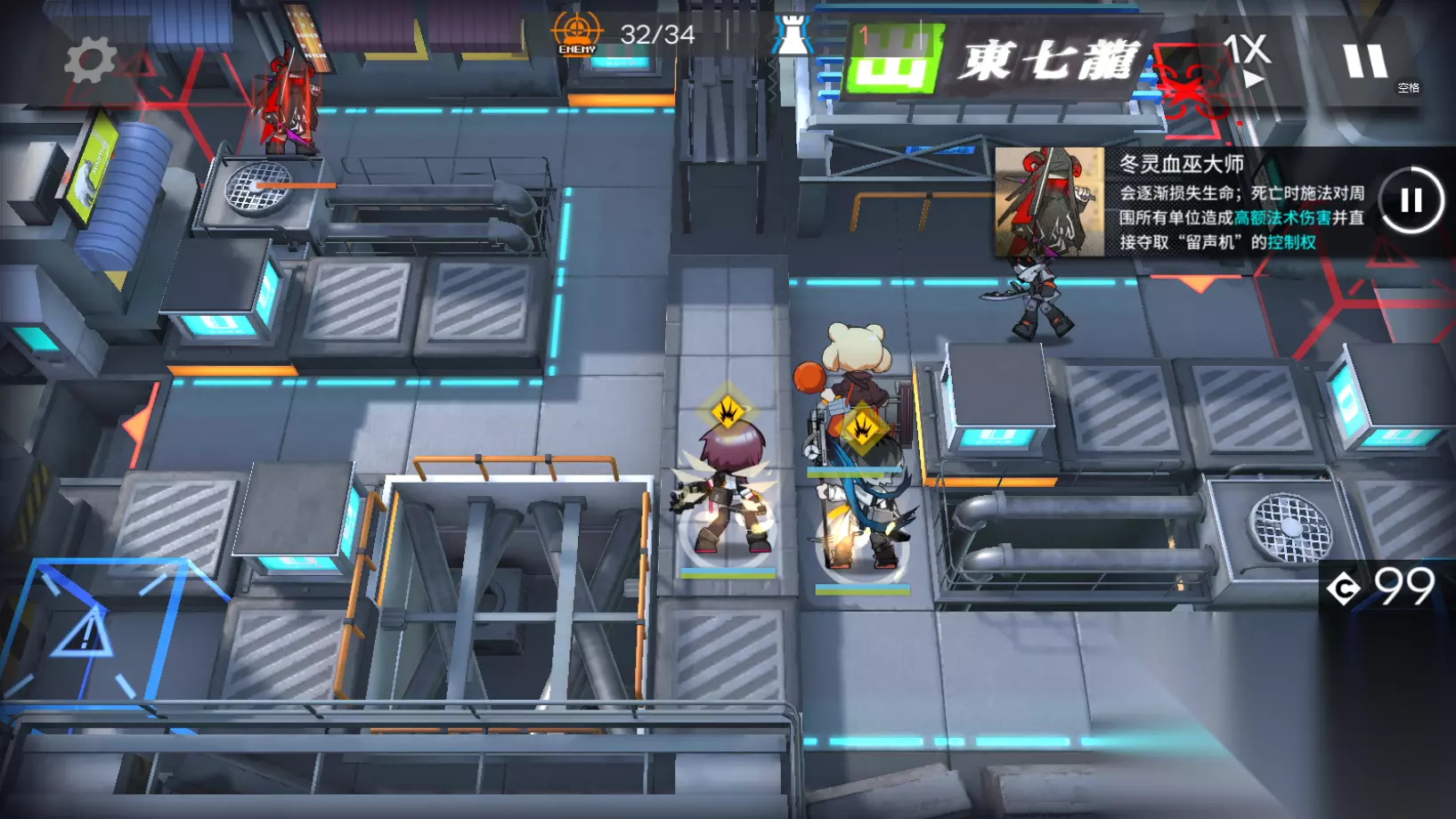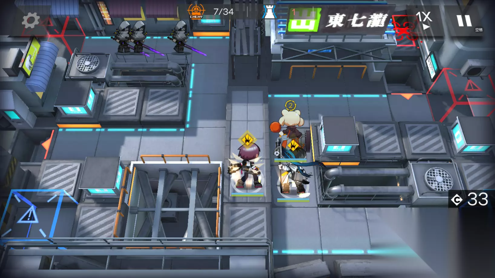 第一波法刀来袭,等到它们进入到能天使的攻击范围内就可以开启技能了,练度高的玩家可以直接把这一波敌人秒掉。极境的技能一定要留给下一波,即便有法刀没有被打死也会被古米拦住,不用担心。